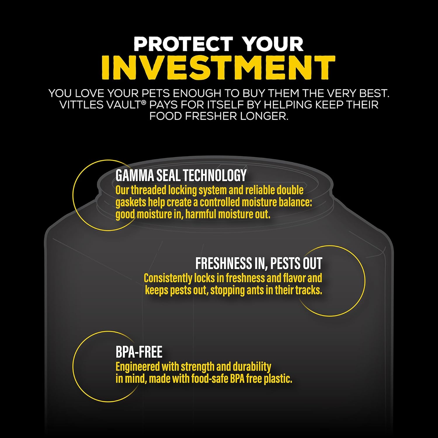 - SAY GOODBYE TO PESKY PESTS: Gamma Seal Technology protects your pet's food by locking in moisture and keeping ants and pests out, making it great for a sealed dog food storage container