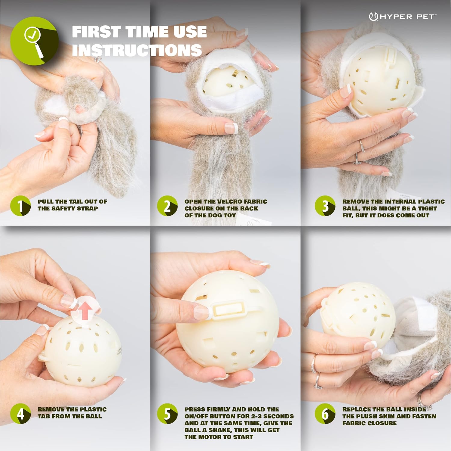 - BATTERY OPERATED PROLONGED PLAY – To change batteries, remove the plastic ball from plush toy cover. Use tab to open the giggle dog toy ball. Remove the battery compartment and insert 3 AAA batteries. This interactive dog toy has an automatic stop feature after a period without use to extend battery life. (Batteries are included with the Hyper Pet Doggie Tail)