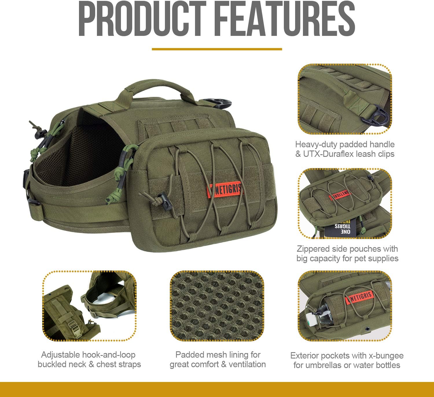 - OneTigris MAMMOTH Dog Pack: Durable 1000D nylon with mesh lining for breathability to maximize function and comfort on lengthier outings