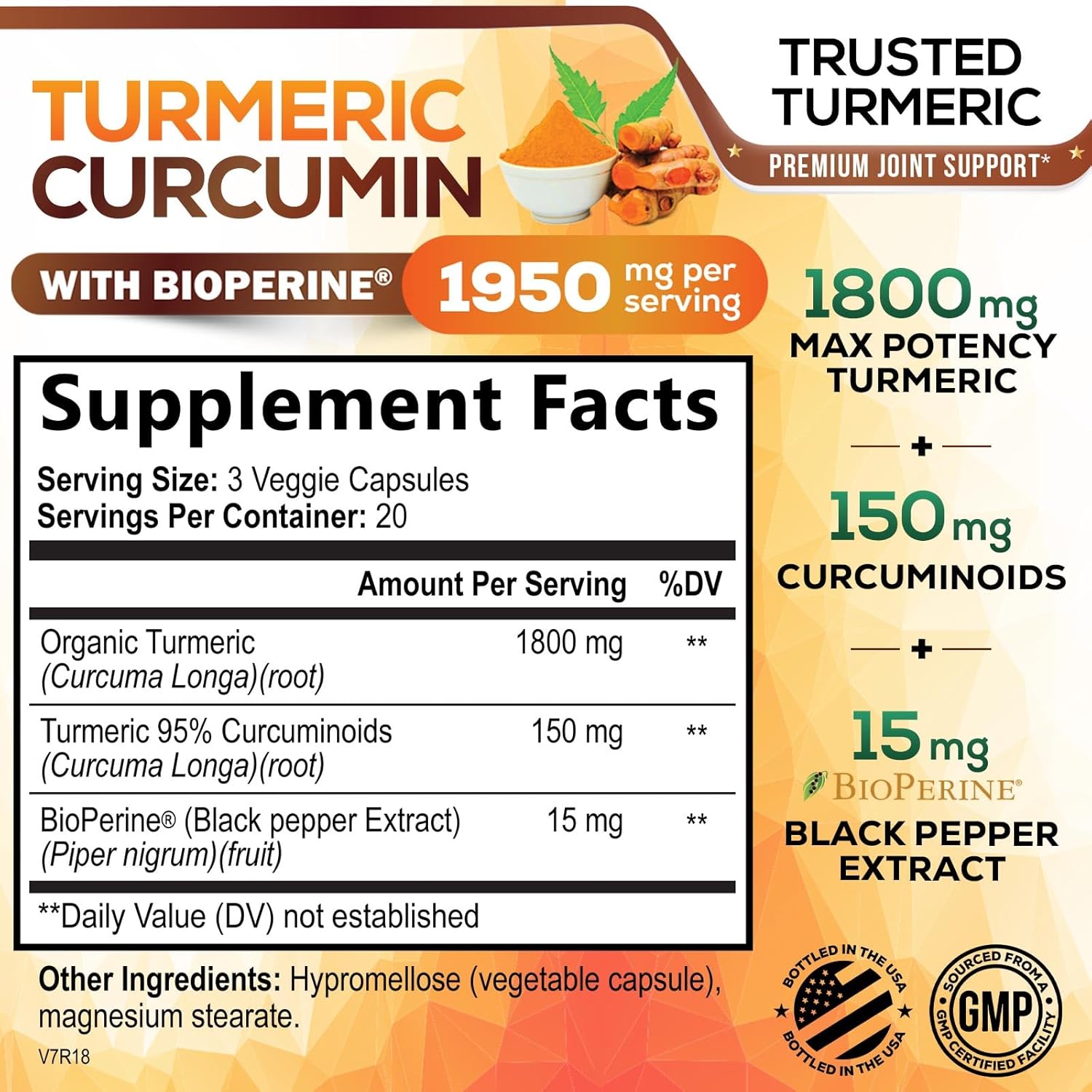 Turmeric Curcumin Supplement 1950mg - 95% Curcuminoids with Organic Turmeric & BioPerine Black Pepper Extract for Best Absorption, Nature's Vegan Joint Support, Non-GMO, Bottled in USA - 60 Capsules