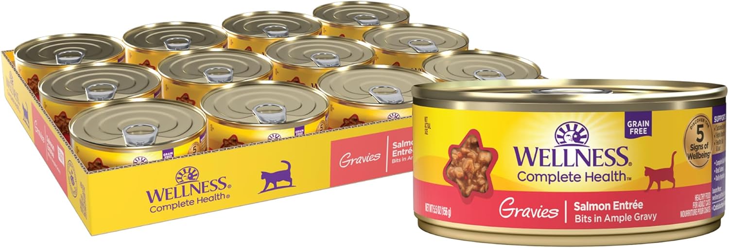 Wellness Complete Health Gravy Adult Wet Cat Food, Natural, Protein-Rich, Grain Free, 5.5 Ounce, 12 Pack, (Salmon Entree)