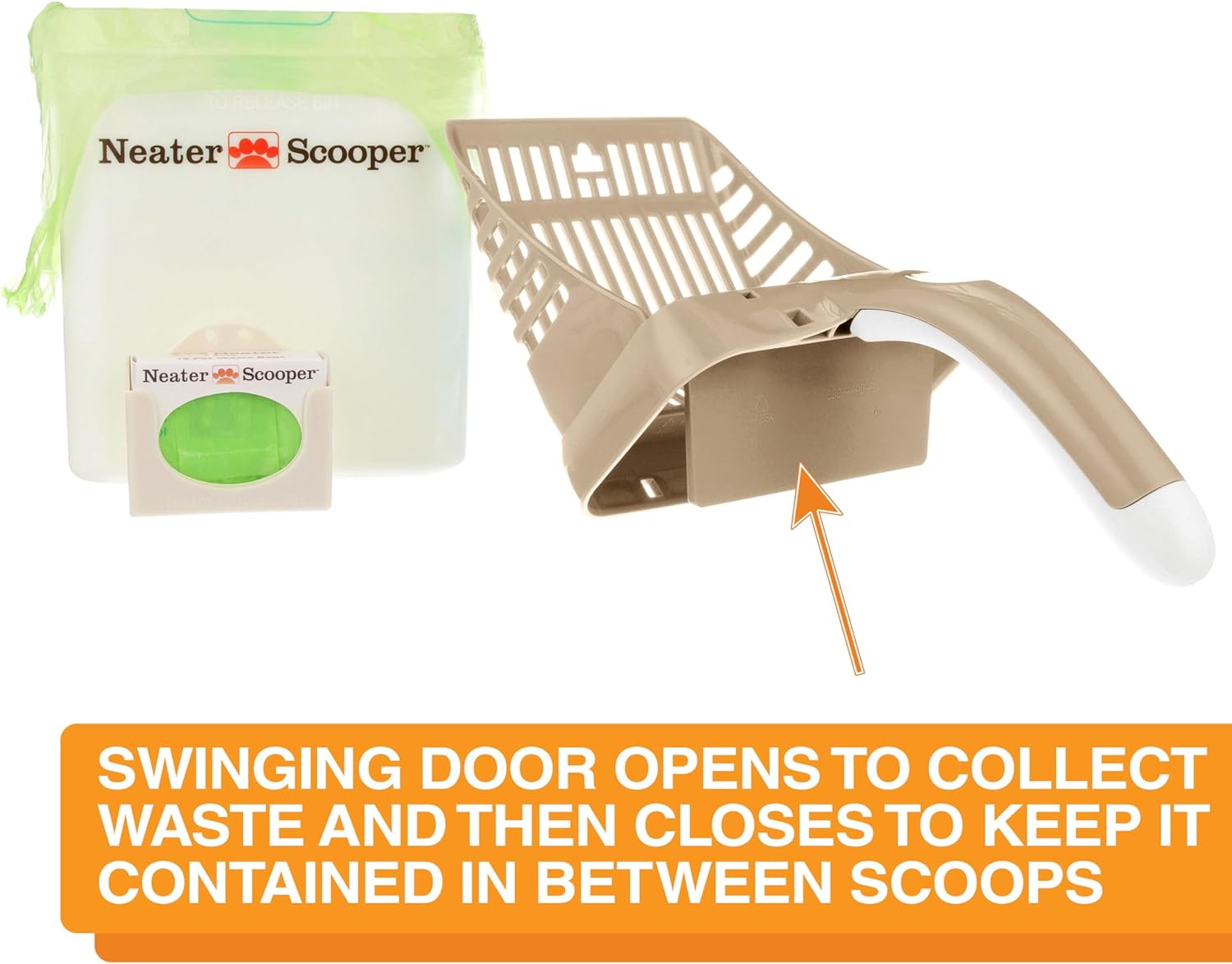 - NO MORE SPILLED LITTER: The Neater Scooper litter box scoop deposits waste directly into a bag, keeping your floors mess-free, reducing dust, and containing odors. Trap door contains waste between scoops. Compatible with all litter types except pellets. Patented & patents pending. Bin measures 6.5” H x 5.75" W x 3.5" D. Made in USA.