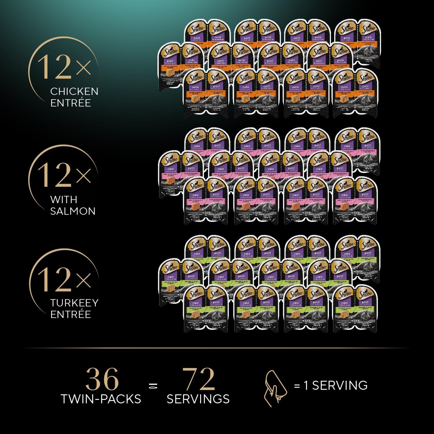 Sheba Perfect Portions Wet Cat Food Pate Savory Chicken, with Sustainable Salmon, and Roasted Turkey Entree Variety Pack, 2.6 oz. Twin-Pack Trays (18 Count, 36 Servings) (Pack of 2)