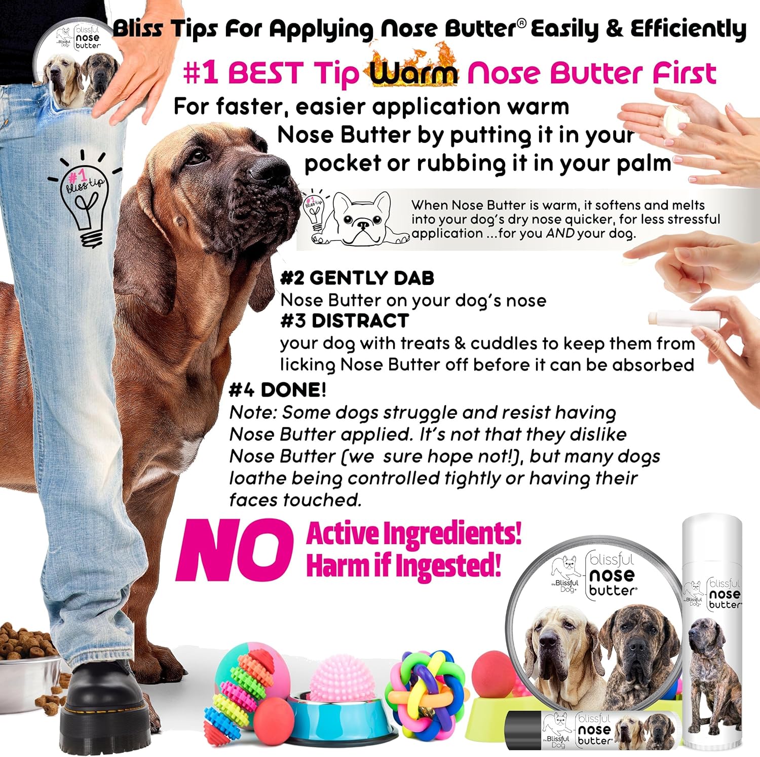 - Easy dog nose care - Easy to apply; Dab onto your dog's nose; that's it! Enriched with shea butter, this dog nose moisturizing butter brings relief to your dog’s dry nose. Non-toxic, no active ingredients, no harm if ingested