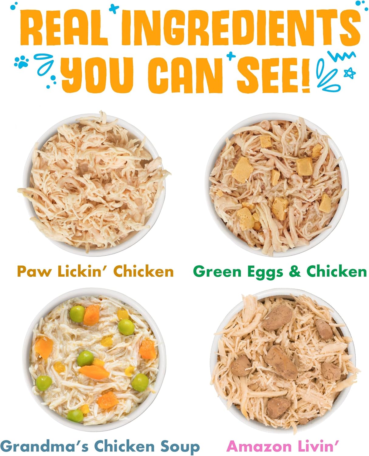- Variey Pack includes 6 cans of each: Paw Lickin’ Chicken, Green Eggs & Chicken, Grandma’s Chicken Soup and Nine Liver.