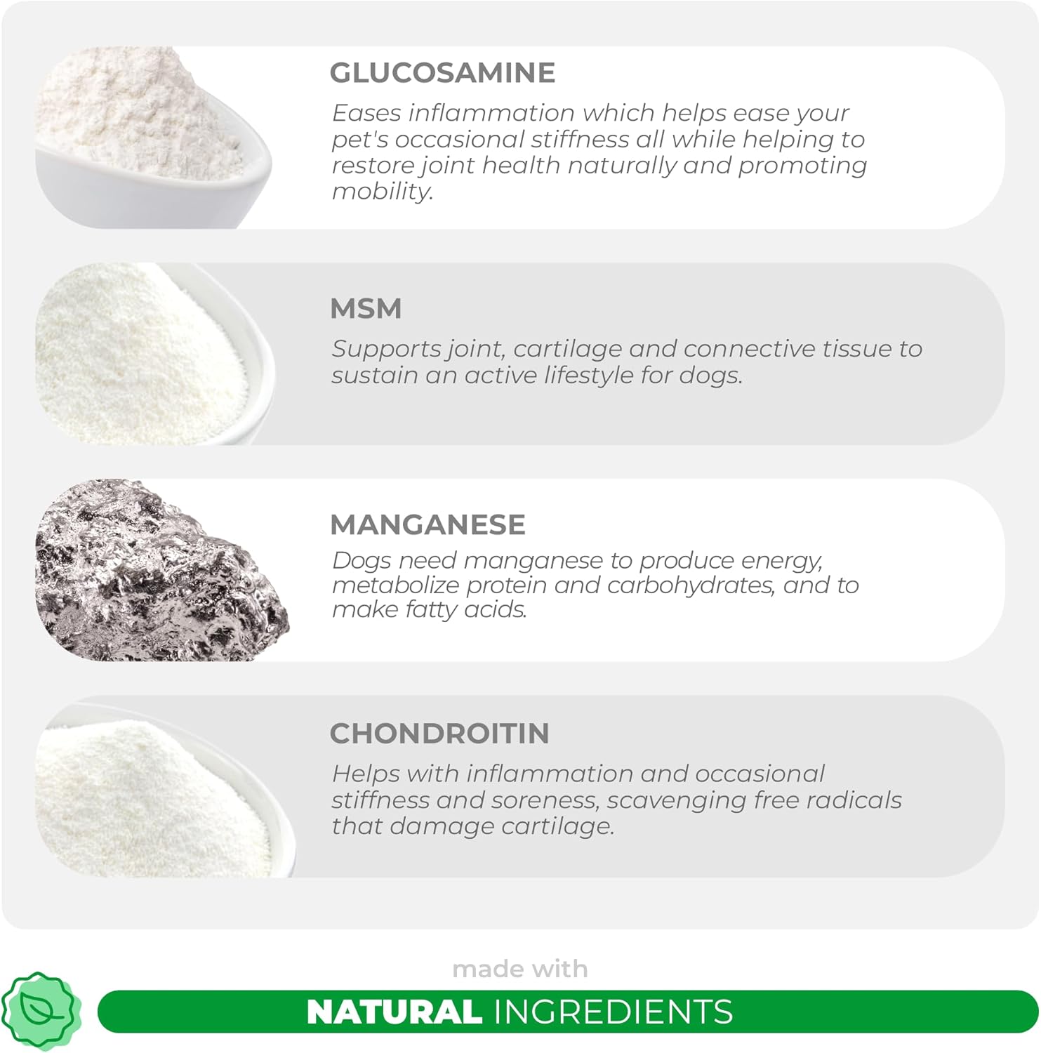 - For Dogs of All Ages - We make our tablets with glucosamine that is perfect for dogs of all ages by helping preserve the integrity of joints and averting deterioration of bone and cartilage.