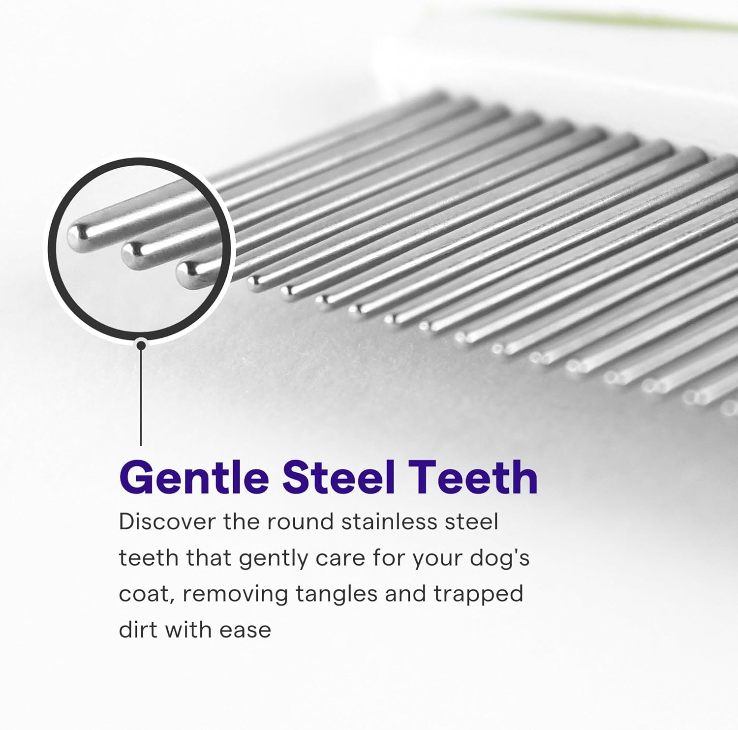 - ROUND & GENTLE COMB TEETH: Unlike dematting combs with sharp teeth, this dog grooming comb features round teeth that break up tangles +effectively remove loose hair, dander & dirt trapped beneath fur.