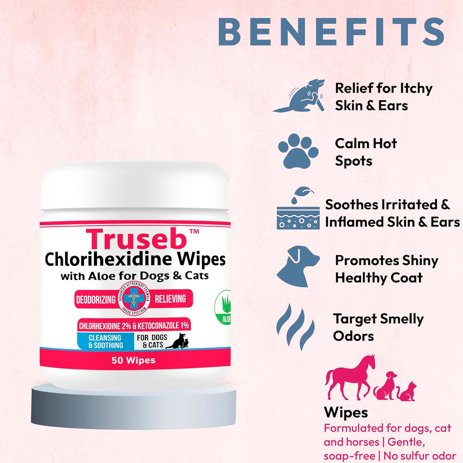 Truseb Topical for Dogs, Cats and Horses - with Aloe for Cleansing (Ketoconazole & Chlorhexidine Wipes, 100 Count)