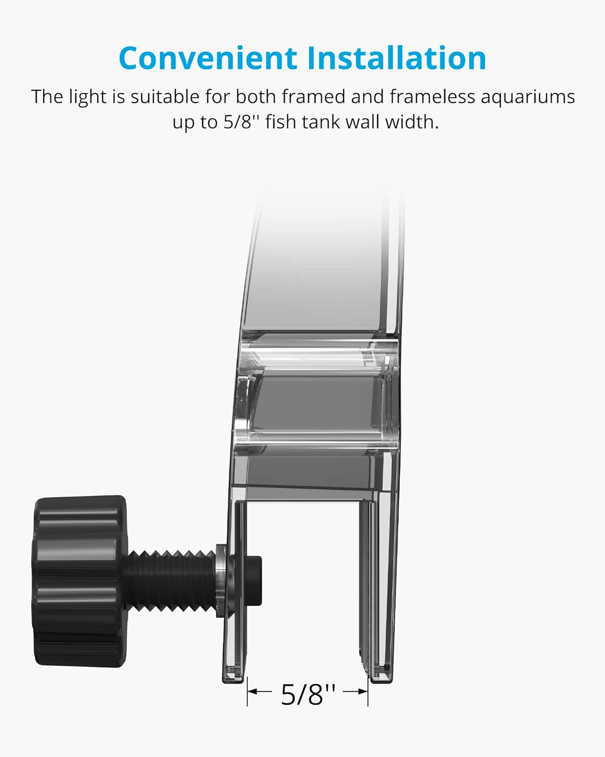 • Easily mounts on and secured to the glass of framed or frameless aquariums up to 5/8'' with the clip on bracket design