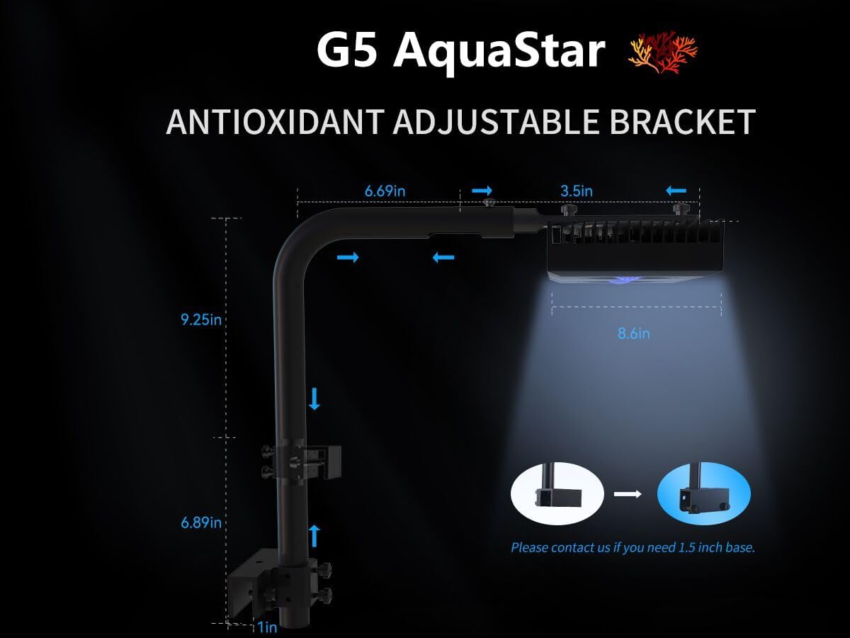 • FLEXIBLE ALUMINUM AQUARIUM STAND - Special Anti-rust design flexible full aluminum with oxidation bracket suitable for different size of coral tanks. Oblate base efficiently increase stressed area and protect coral reef tank well. Ideal coverage of G5 coral light is 20-28 inch. Tank glass thickness: 0.2-1.0 inch