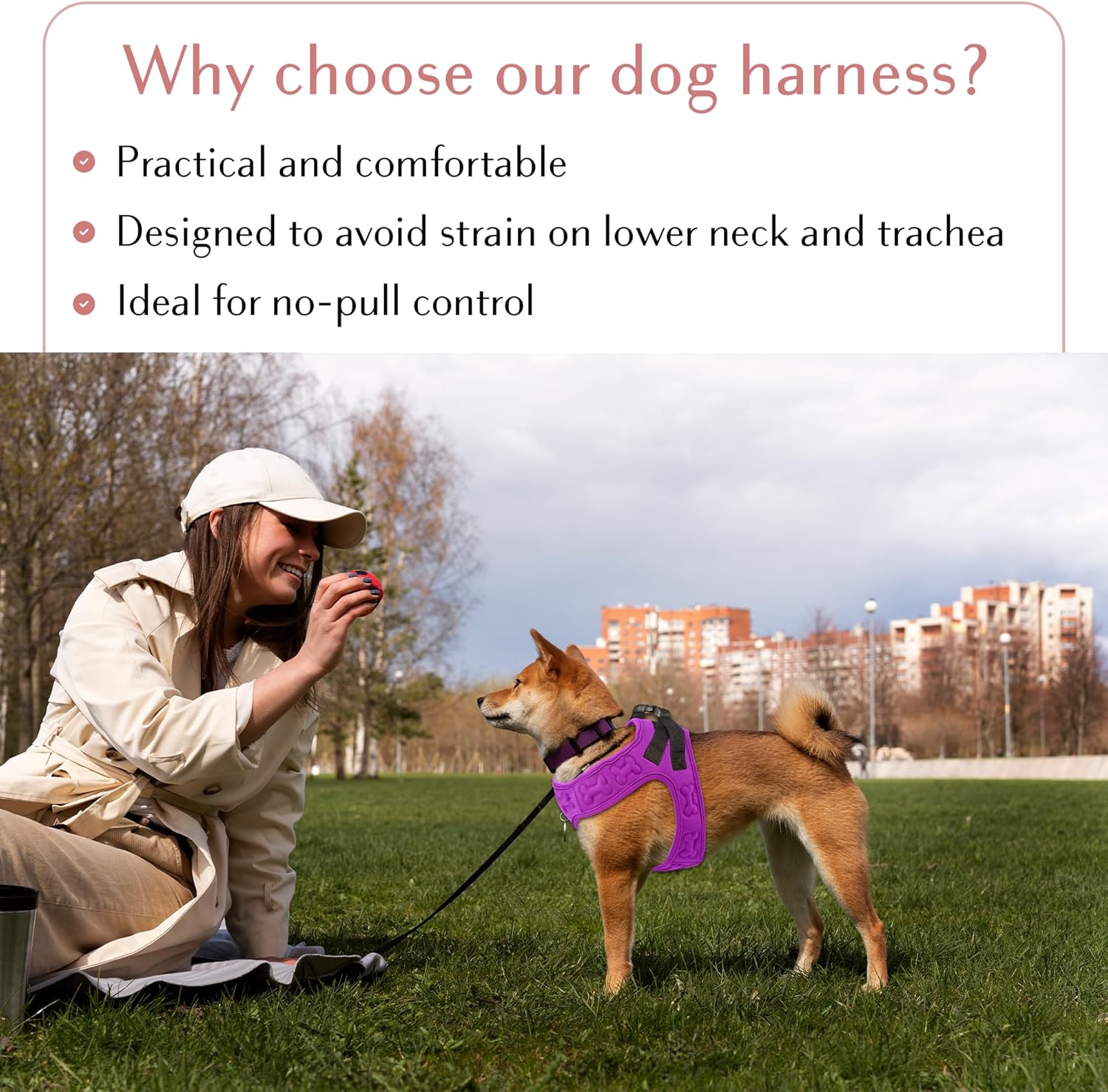 • All-Day Comfort – Designed with soft, breathable padding, this harness ensures your dog’s comfort on walks, minimizing pressure on their chest and reducing the risk of chafing.