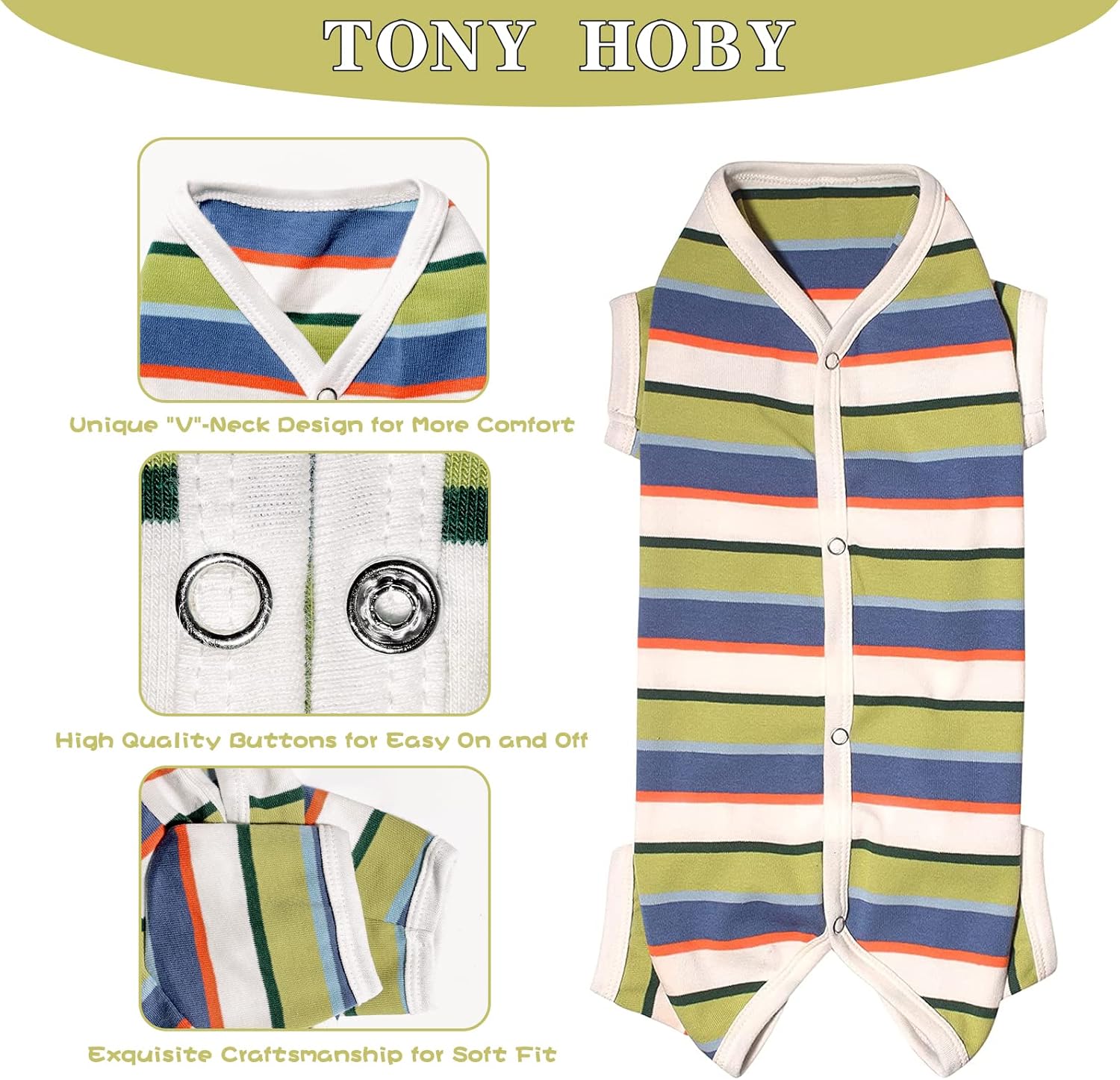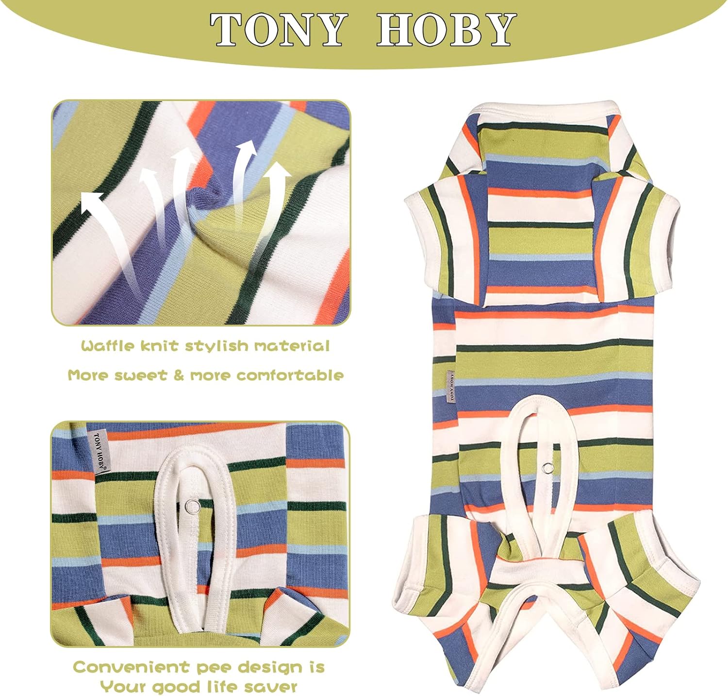 - 【Special Design】-TONY HOBY Female/Male Dog Pajamas has a unique design for men and women, focusing on protecting the dog's abdomen; and using metal buttons, easy to wear; unique four-leg design, elastic waist, and with bright stripes, beautiful and fashionable.