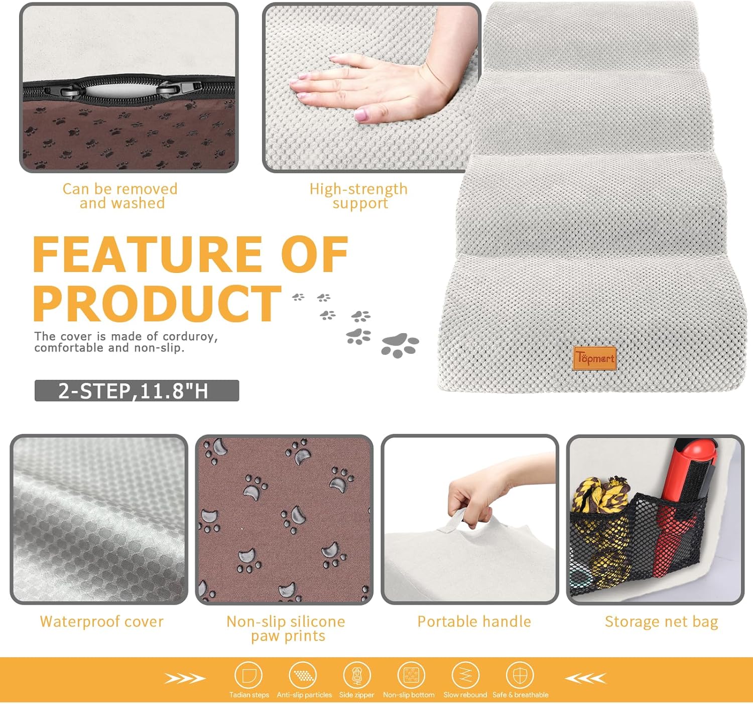 • Safer,Wider&Deeper Steps:Each step is 15.75in x 7.1in.Our dog stairs are excellent for those older dogs who are less mobile as they age or for cats with injuries. More wide and deep steps are helpful for reducing the strain that constantly jumping up and down onto bed,sofa or car can have on your pet's joints,and topmart dog steps will not shake and slip during use. The cover made of corduroy is more frictional than other covers, pets will not slip on the stairs.