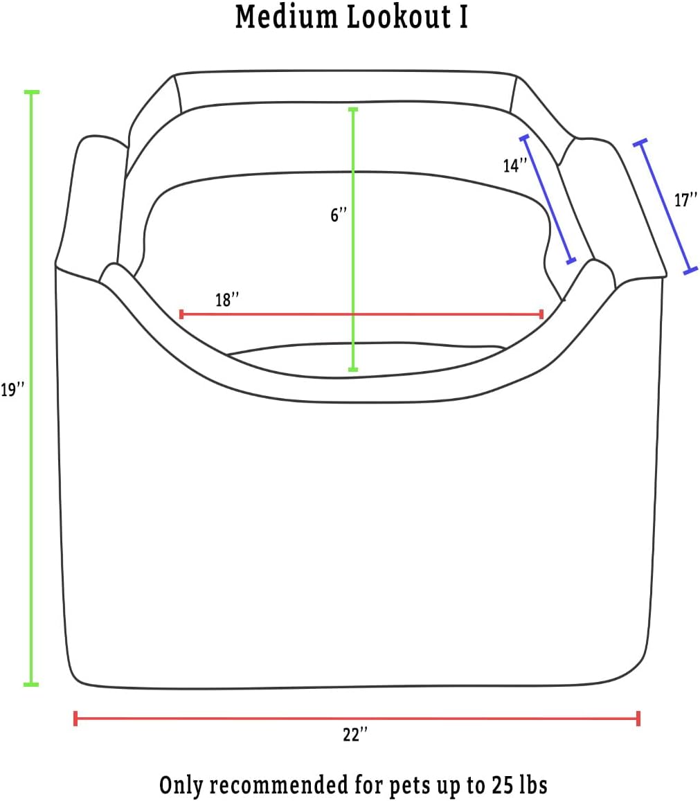 - This dog booster seat for small dogs under 25 lbs raises your pup 6β to allow easy viewing out of the window. The removable pillow can add additional height if necessary. The enveloping microsuede interior is 18β x 14β and boasts 6β tall sidewalls to secure small breed dogs under 17β in length (like pugs, corgis, and dachshunds) within the dog car seat. The Lookout dog car seat measures 17β³H x 22β³W x 19β³L and is an ideal back seat or front seat dog car seat, fitting snugly inside a single seat.