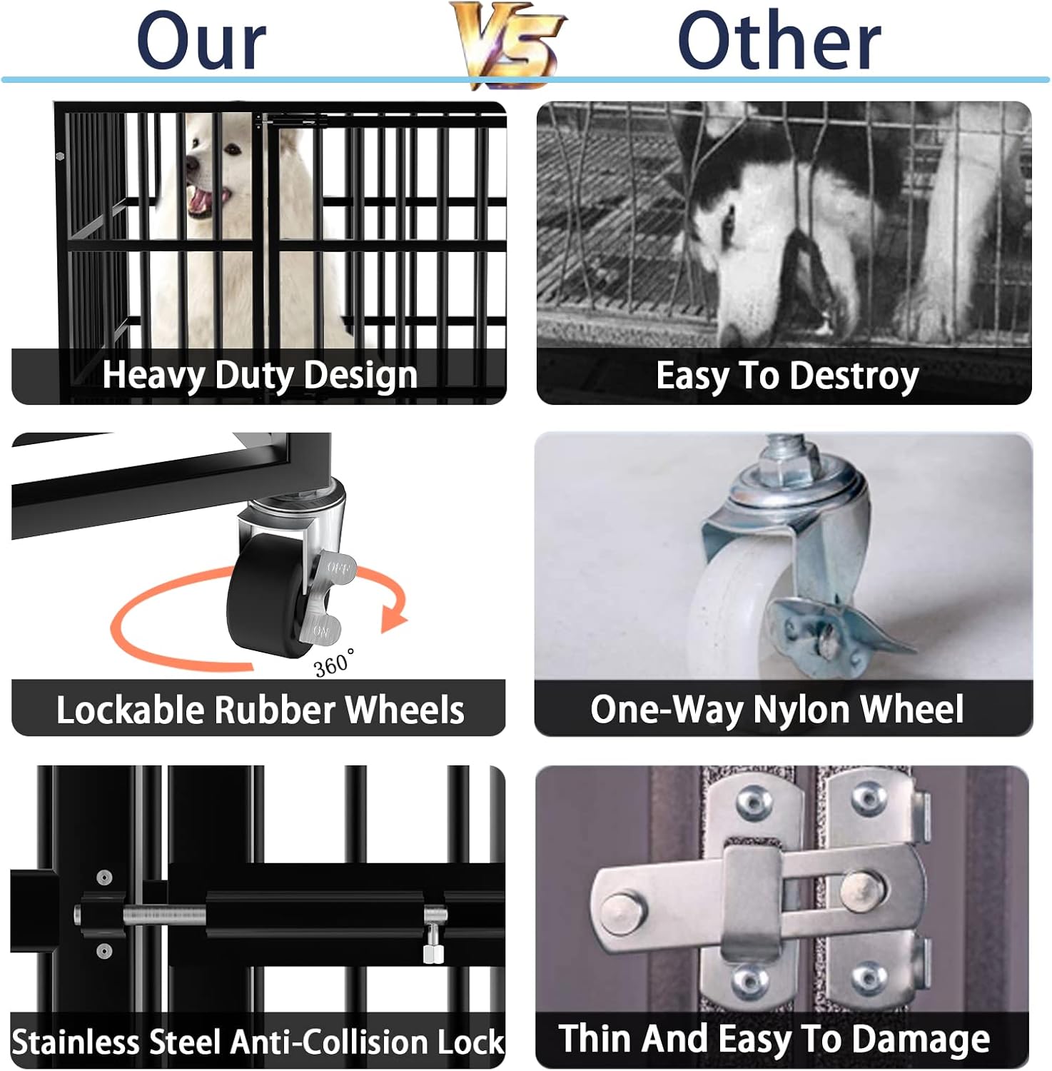- Easy To Assemble & Move: The four caster wheels on the bottom are lockable, and we like that the design makes it difficult for high anxiety dogs to escape or cause harm to themselves or damage the cage.Most of the parts were pre-assembled, fit it with four wheels and ten screw bolts, only takes within 10 minutes to complete.