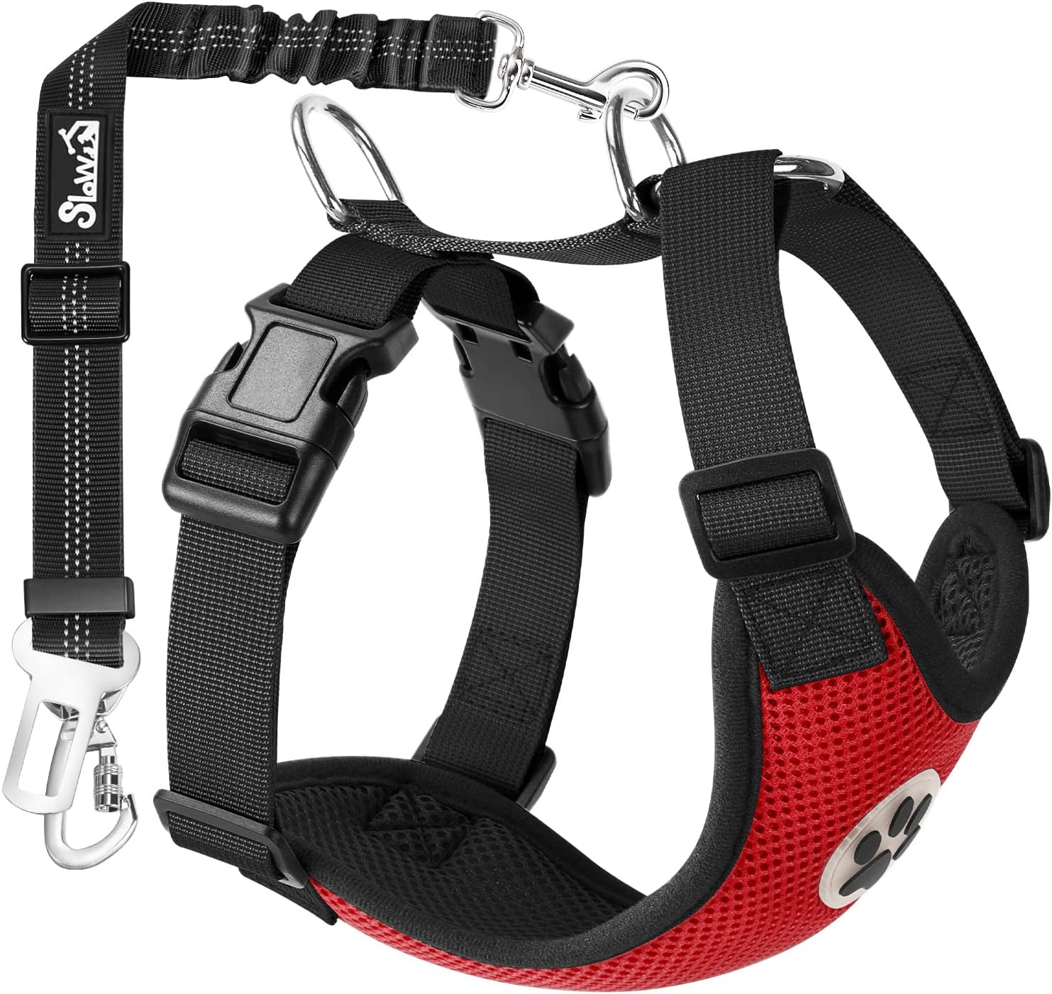 SlowTon Dog Seat Belt Harness for Car, Dog Car Harness Adjustable Mesh Breathable & Dog Seatbelt Safety Tether with Elastic Bungee for Small Medium Large Pets(Red, Double Clip, S)