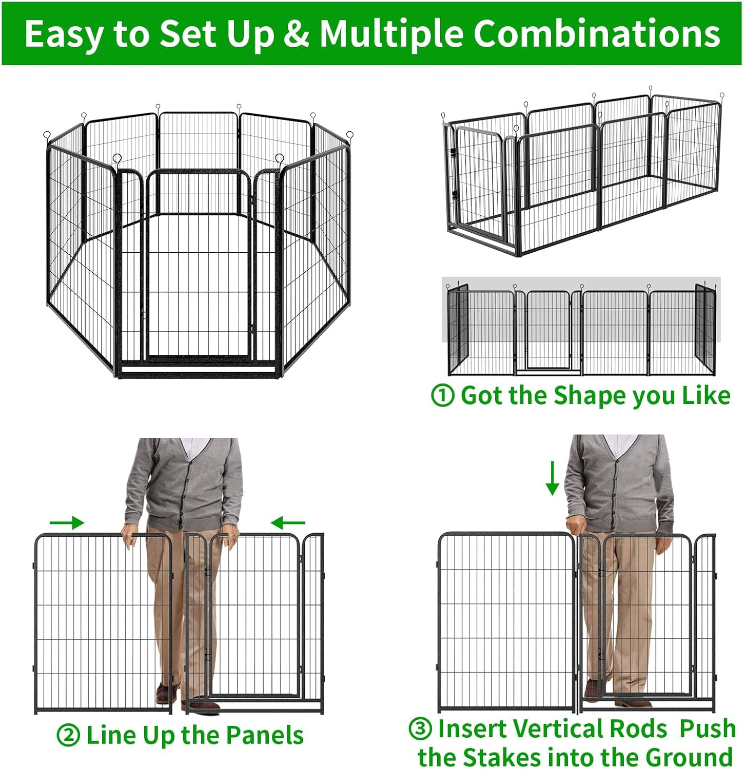 - 【Easy to Set Up & Multiple Combinations】The panels come with individual poles to connect them together, easy to set up or take it down in minutes, dog fence can do multiple combinations and configurations, dog playpen for the yard easily conforms to different shapes according to your garden or room, circle, polygon, irregular, etc