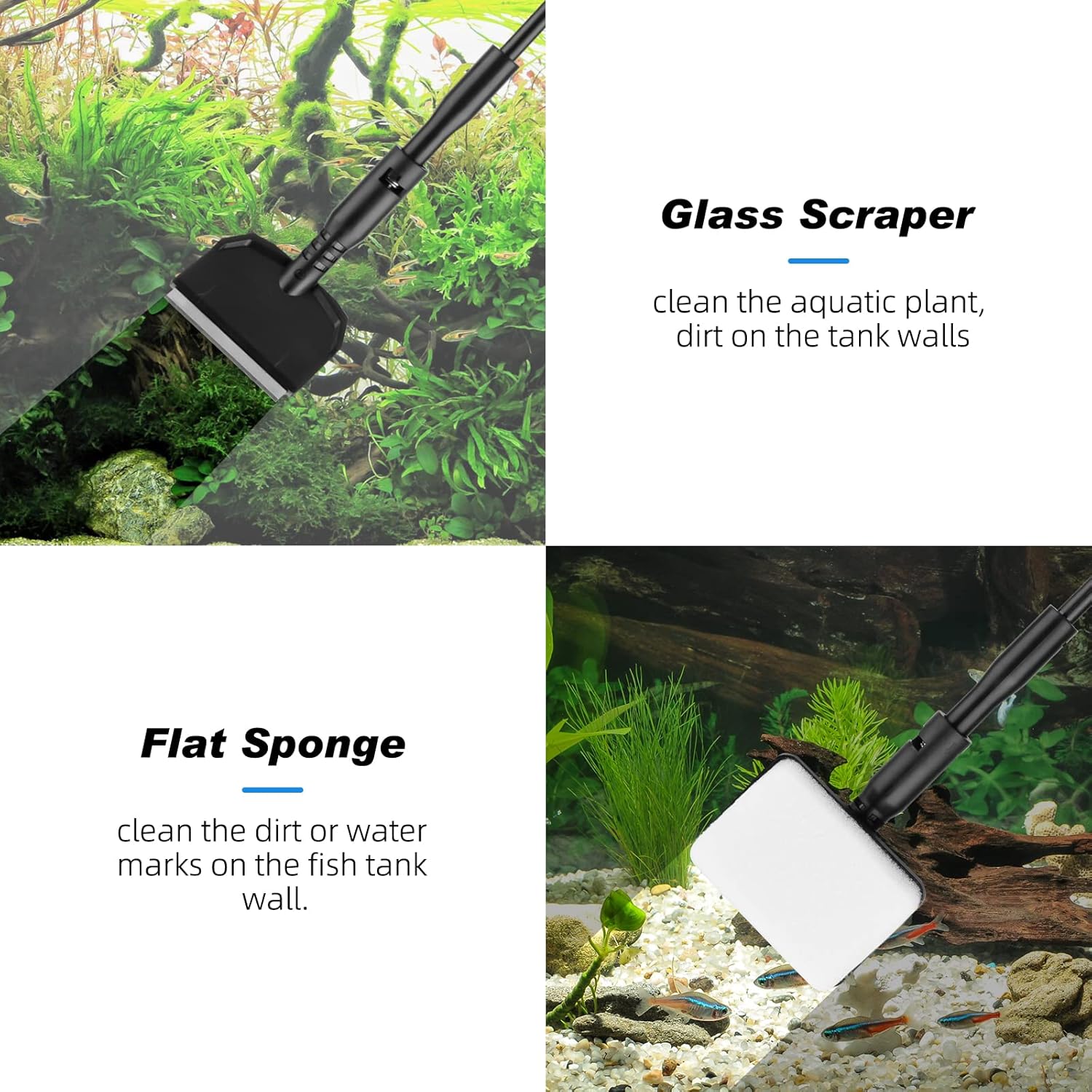 • Easy to install and use: The aquarium cleaning kit is easy to install and remove. Simply attach the handle and accessory holder to the rod,only takes a few seconds. Made of durable ABS plastic, non-slip handle, corrosion-resistant rod can be used for a long time, not easy to bend and rust