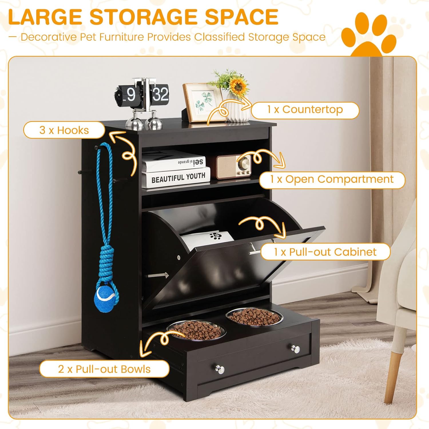 • 【Hidden & Pull-out Design:】The bottom sliding drawer can be easily pulled out to reveal a food and water bowl for eating and easily close to hide the food and water bowls. The elevated dog bowls are ergonomically designed for a correct feeding position for neck protection. Besides, the dog food storage cabinet with tipping design is easy to open and close.