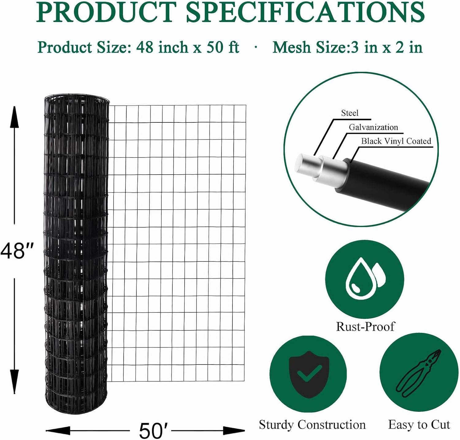 - The inner wire diameter is 16 gauge (1.5mm), after vinyl coating 1.9mm. Mesh size 2"x3". Measures 48 inches in height and 50 feet in length. Black color.