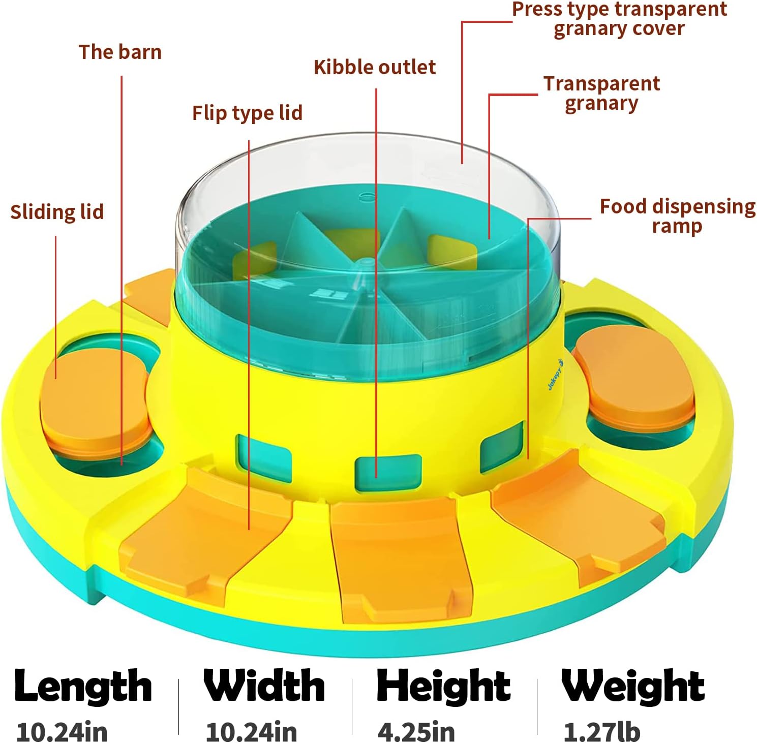 - đžăEasy to UseăDog puzzle toys have 6 flip type lids, you can add food to the granary, pets press down on the transparent lid, food will fall into the leaky food-box. Pets also can eat food by moving 2 sliding lids.