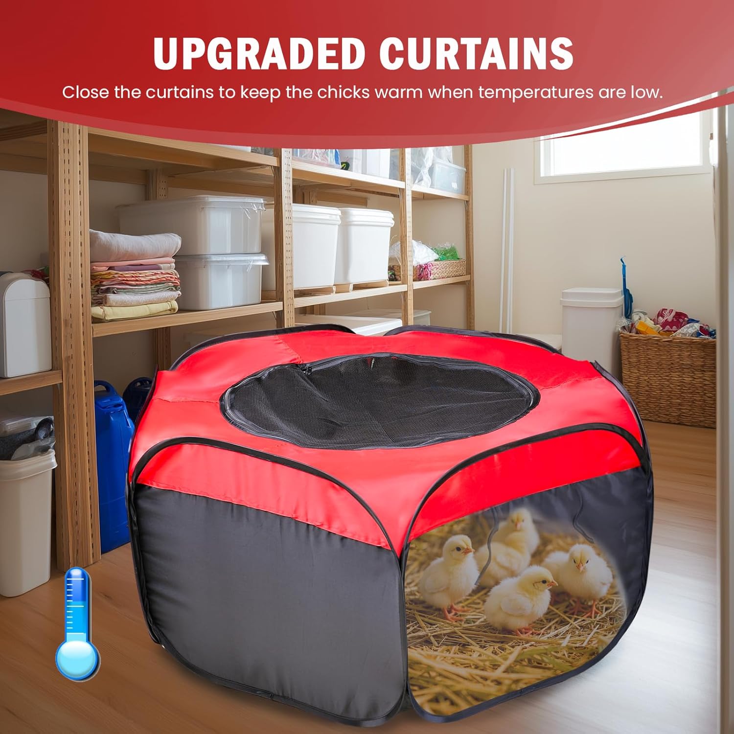 - INDOOR & OUTDOOR USE - Perfect for indoor or outdoor settings, this baby chick brooder features an advanced double-door design, three-sided mesh design, and escape-proof mesh. The warm curtains is perfect for outdoor, providing excellent cold protection. Indoors you can open the breathable mesh panels, which offer good ventilation to ensure a cool and comfortable environment. while also preventing the chicks from escaping. This playpen will keep your chicks safe, happy, and comfortable.