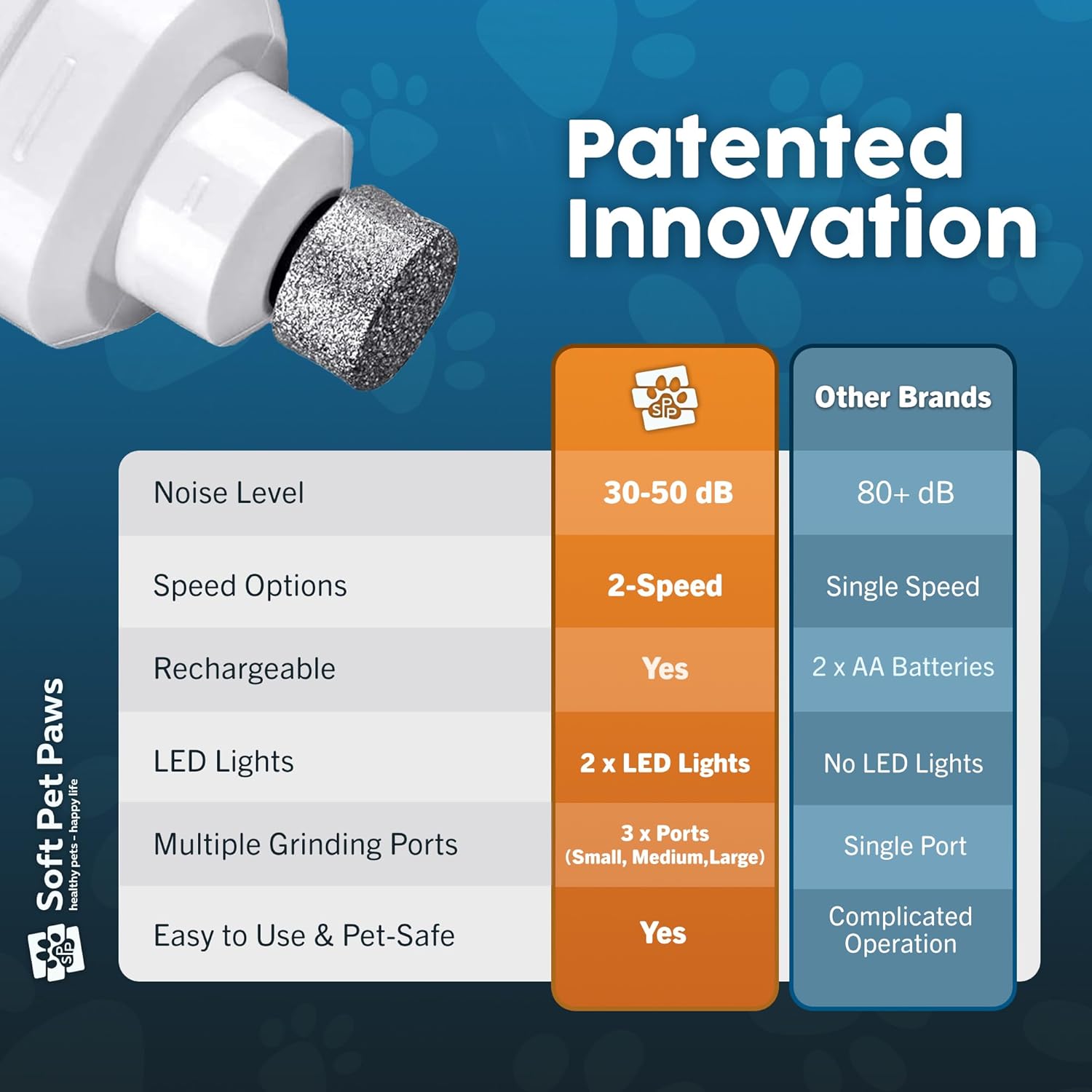 - Ultra-Powerful Grinder for Small, Medium, and Large Dogs: Soft Pet Paws' new dog nail grinder boasts a 4.8-volt motor, making it 5 times more powerful than its predecessor. This powerful motor can easily grind down even the toughest nails of larger dogs in just a few minutes