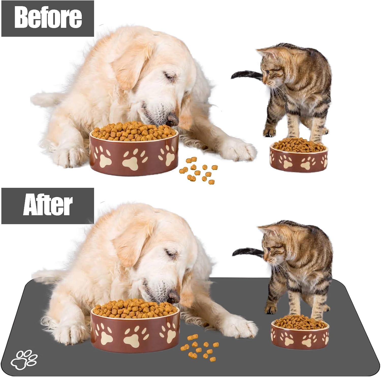 - Keep Clean & Durable:Unlike traditional silicone pet feeding mats, our dog mat for food and water won't pick up pet hair or dust, and won't build up tough-to-clean limescale, keep the dog bowl mat as good as new forever. Sturdy dog & cat food bowl mat cannot be torn easily and avoid eating by mistake. Making your cleaning more worry-free and giving your pet a clean eating environment.