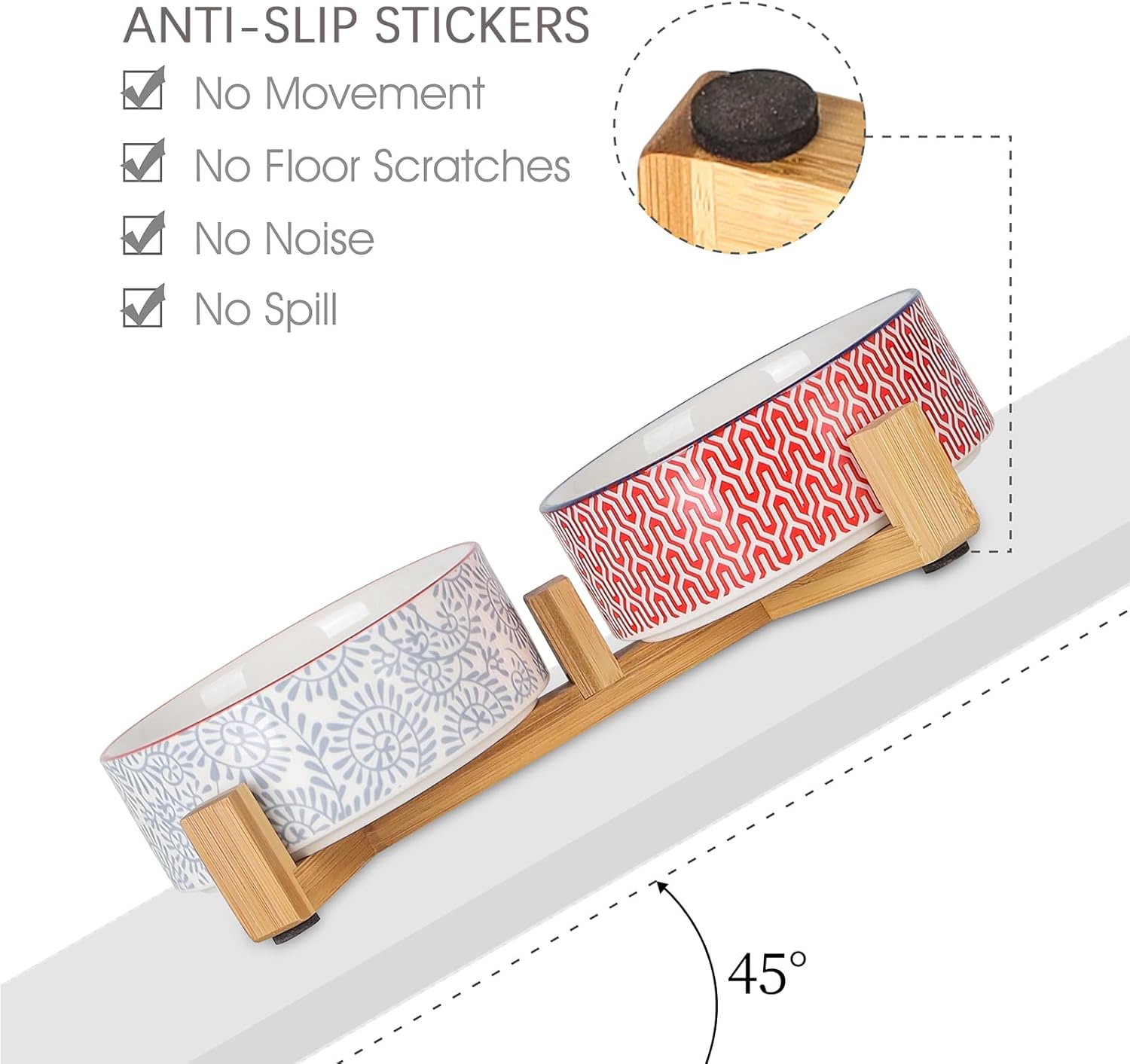 Selamica Ceramic 14 oz Dog Bowls - Anti-Slip Pet Dishes Set with Wooden Stand for Cats & Small Dogs, Weighted, Assorted Colors, Food & Water Dishes