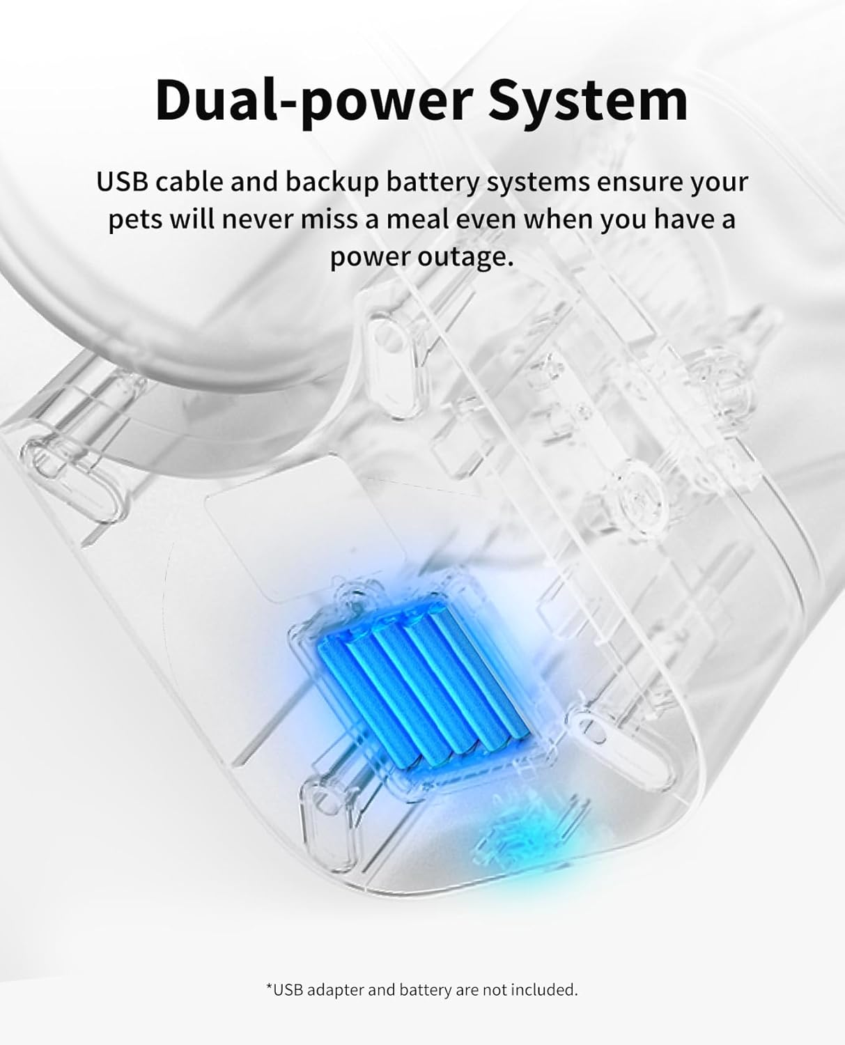 - Dual Power System: The automatic pet feeder comes with a USB power cable (Adapter not included) and can also be powered with back-up 3A batteries to prevent power outage, ensuring scheduled feeding is consistent. Please note, usb adapter and batteries are not included in the package, a 5V/1A adapter is required.