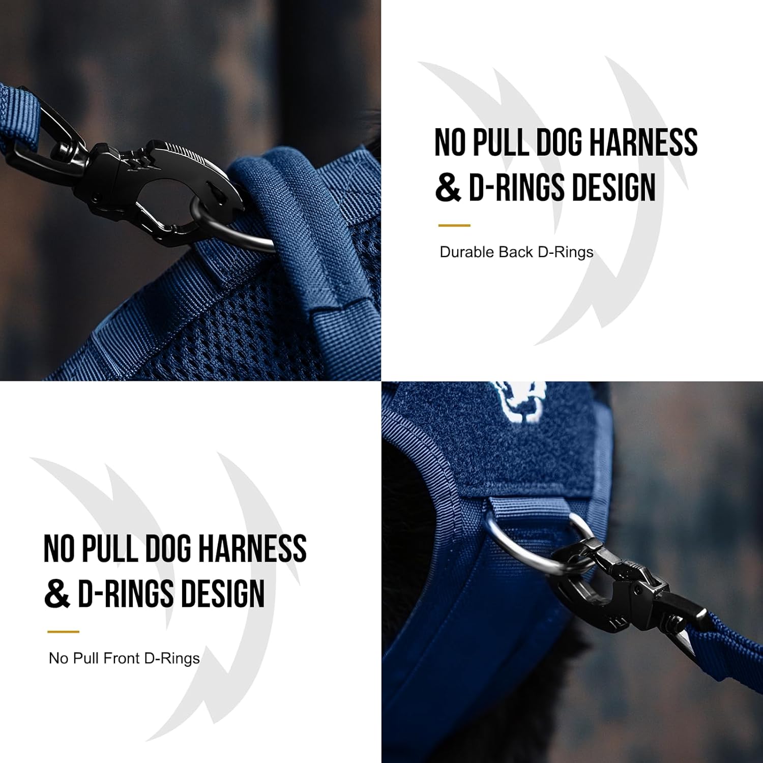 - [No Pull D-ring]: 3 stainless steel D-rings at the front chest and back for training, short and long leashes, with 4 UTX-Duraflex quick-release buckles and 6 fully adjustable straps.