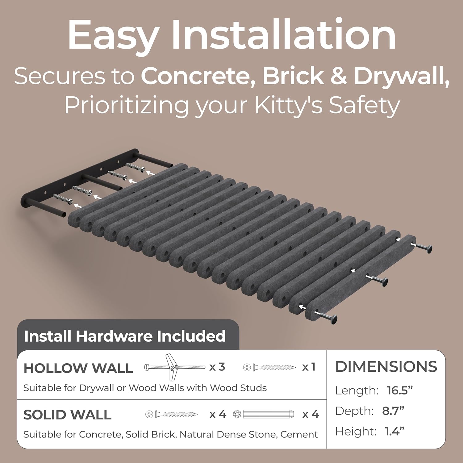 - Effortless Paradise: This cat wall bed includes all hardware, allowing your fur-baby to start exploring right away. Our cat climbing shelf securely attaches to concrete, cement, brick, dry wall and more ensuring your catās safety.