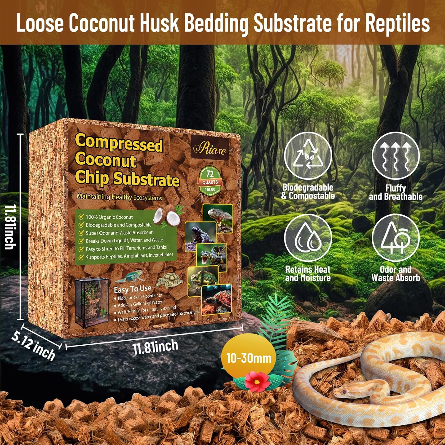 Riare 10LB Coconut Chip Substrate for Reptiles, 72 Quart Coconut Fiber Substrate Coco Chips Substrate Coconut Husk Bedding for Snakes, Tortoises, Ball Python, Bearded Dragon, Geckos, Lizards, Frogs
