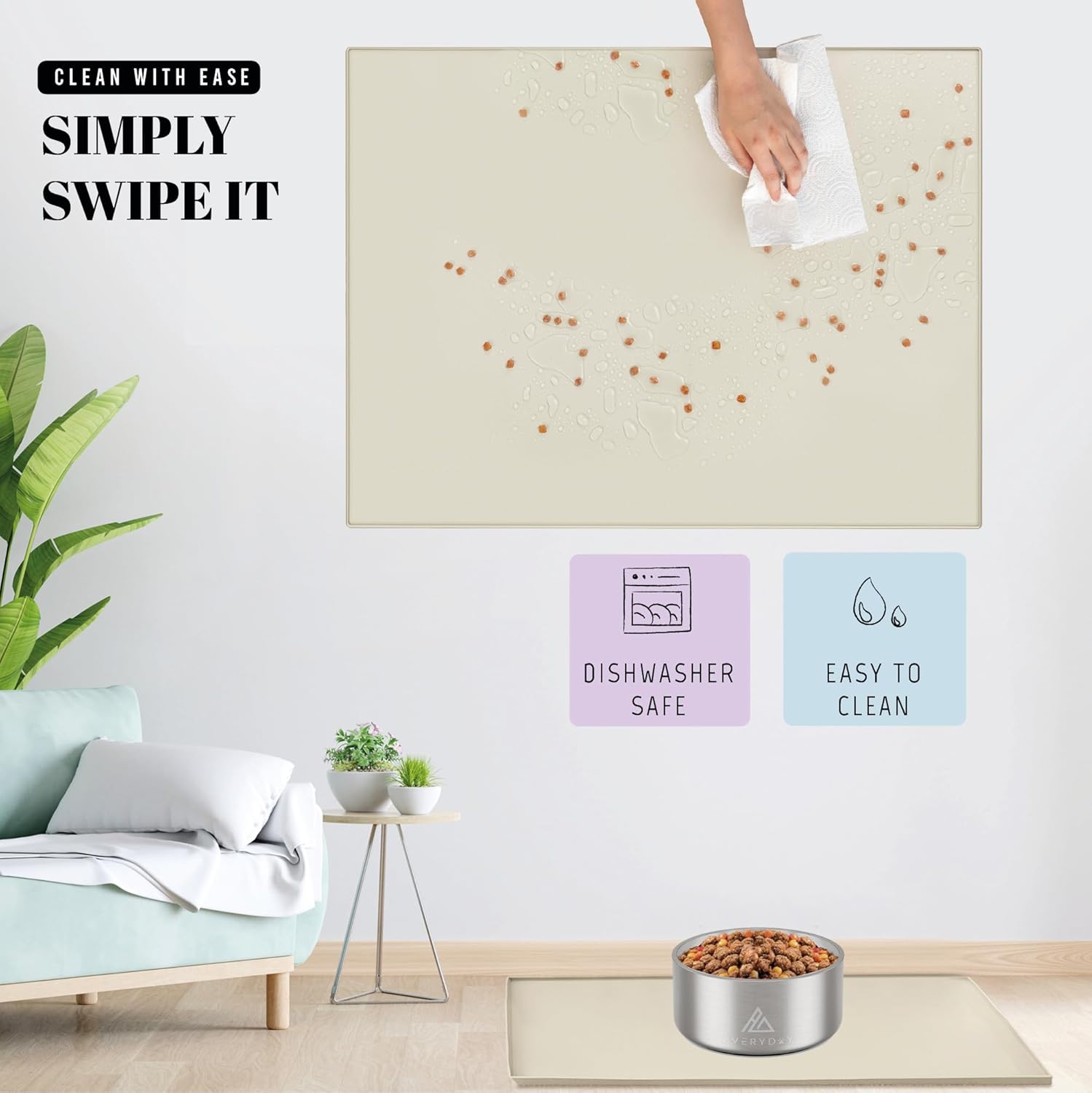 - Non-Slip Design: No more sliding bowls! AVERYDAY's heavy-duty pet mat stop bowls from sliding during meals. The dotted surface boosts slip resistance, ensuring your pets' food and water bowls stay securely in place