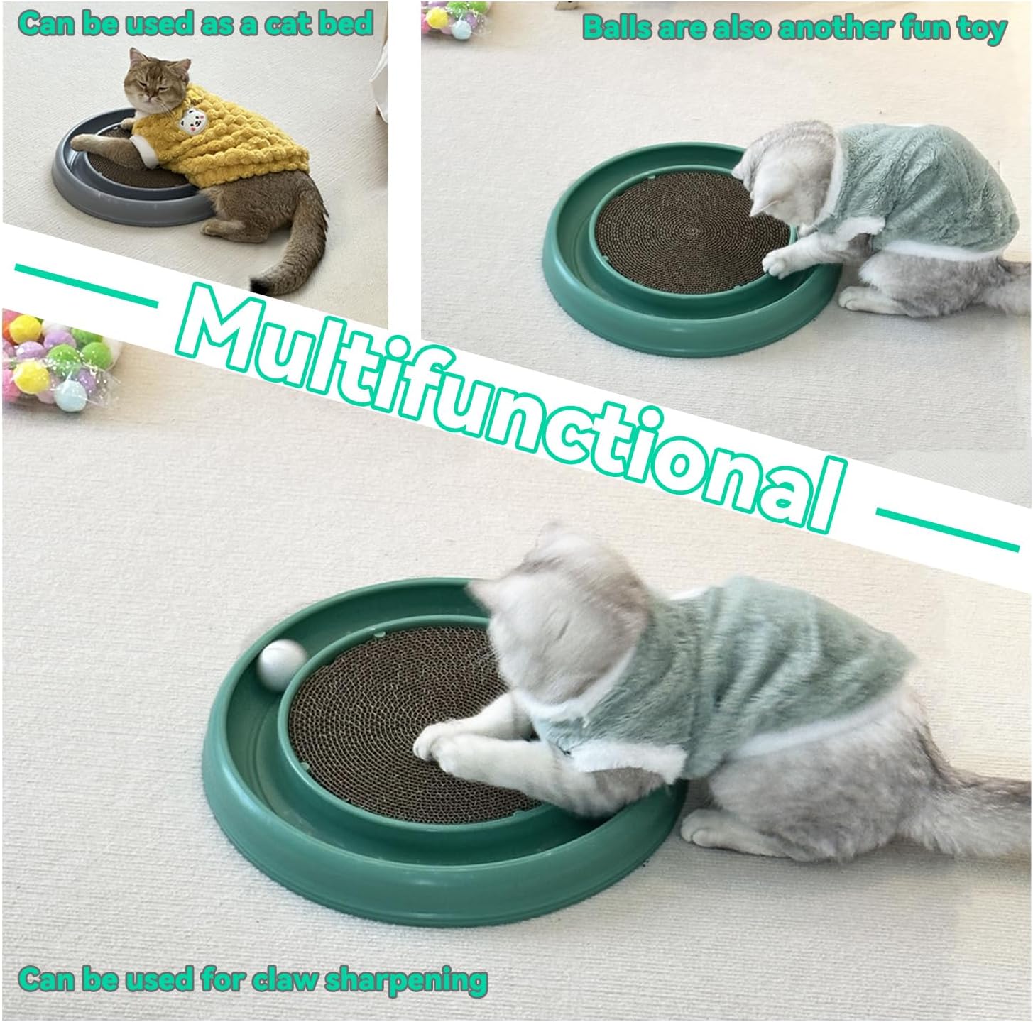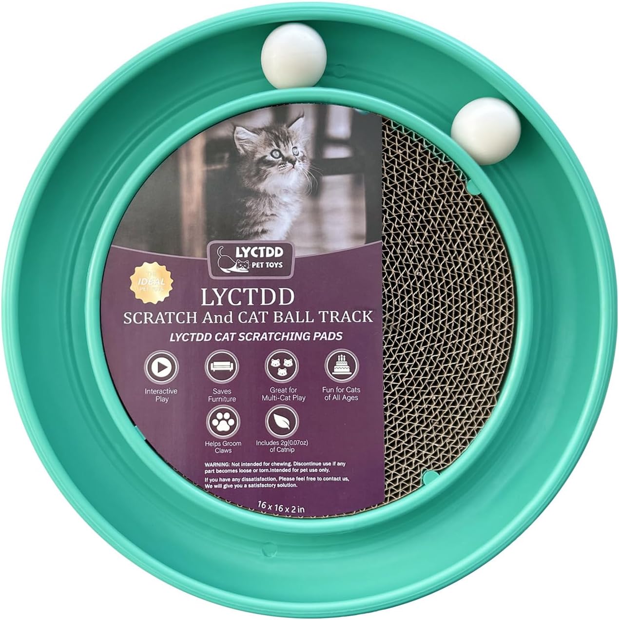 - 【Cat Scratching Board Set】:The round cat scratcher toy comes with 1 cat ball track base (16 inches in diameter),Toys for all kinds of big and small cats,1 round cat scratcher refill (11 inches in diameter),2 rolling cat toy balls,Preventing Loss,that keeps your cat entertained for hours.