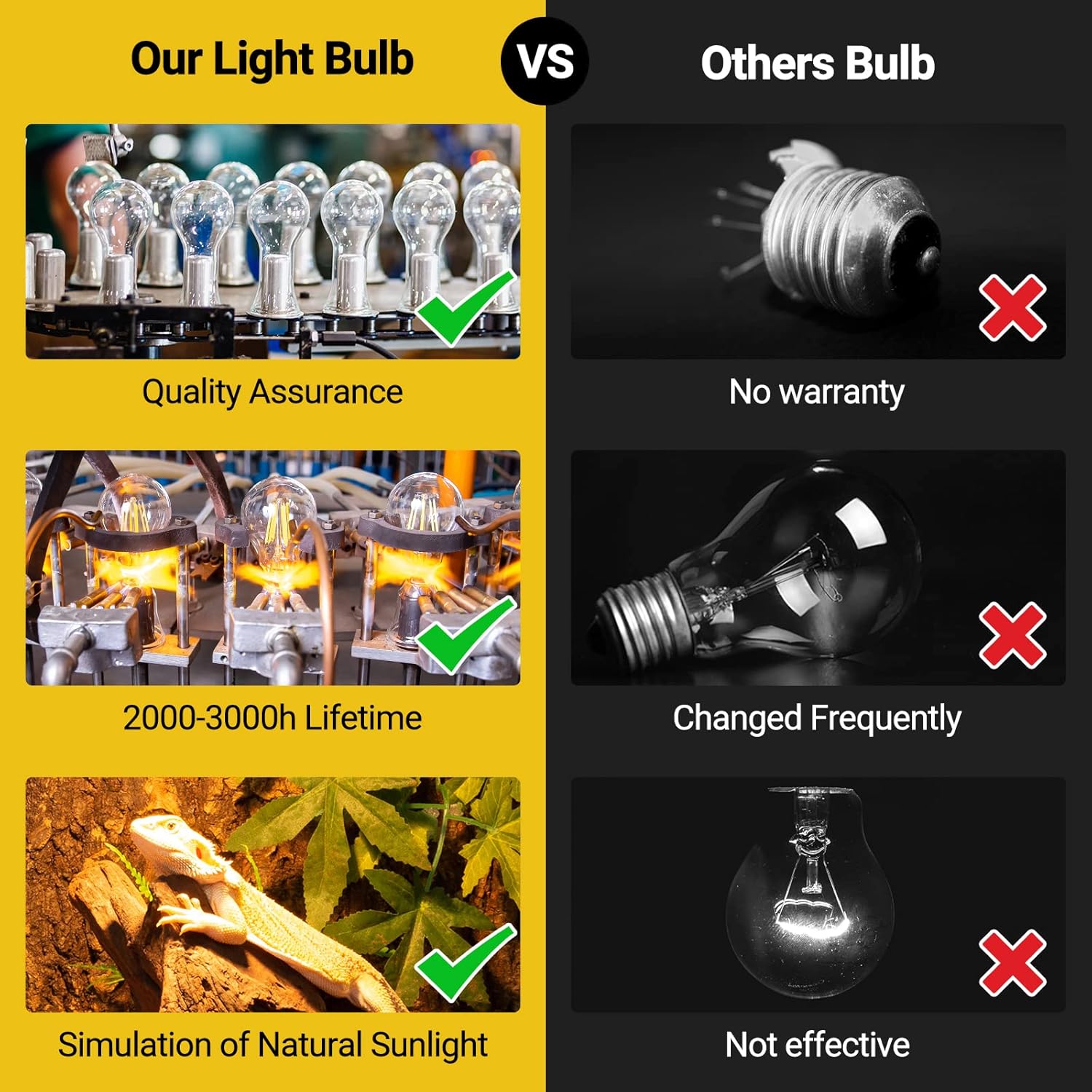 - ăSimulating Natural LightăThis heat lamp simulates natural sunrise and sunset to achieve even and quick heating and bring your pet back to nature. The reptile heat bulb provides soft heat light and UVA for reptile living, promote the appetite of your pet, create a healthy environment for reptiles, ensure their healthy and natural growth.