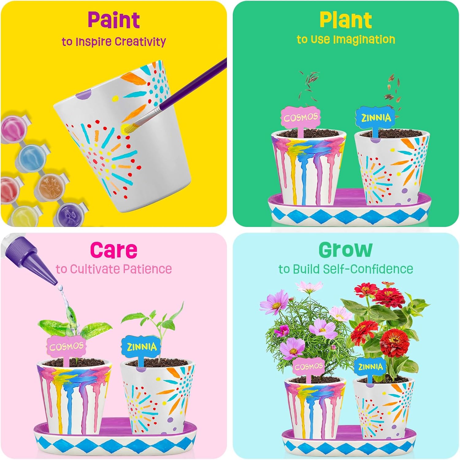• 4 SET GARDEN KIT: Paint the 4 ceramic pots, 2 ceramic trays, and plant markers, and sow the Marigold, Cosmos, Zinnia and Portulaca flowers with imagination and patience. Have fun while crafting with the included step-by-step instructions.