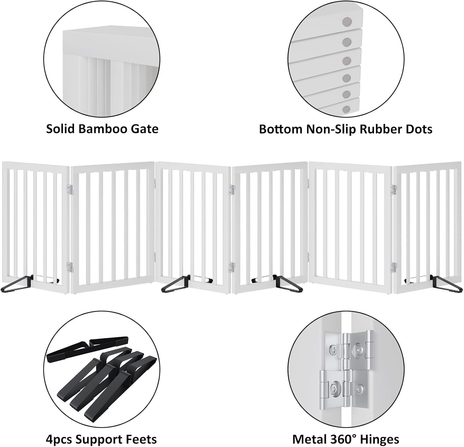 - 🐶Stable and Durability🐶: This pet gates for dogs is designed with an attractive bamboo surface and sturdy non-slip rubber bottom dots that are very stable and strong when used with the support feet, and will not cause potential damage to your home. This versatile dog gate indoor is a pet enclosure, room divider, and dog gates all in one to meet all aspects of your scenario!