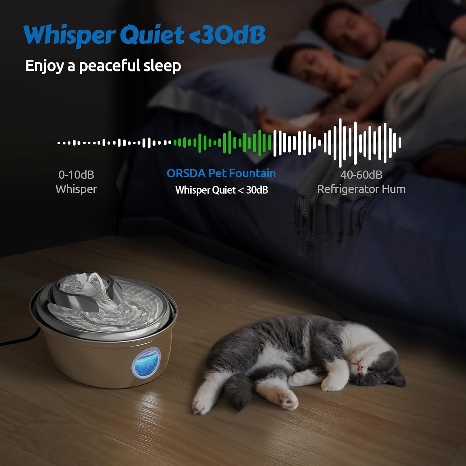 - đ˝ăUpgraded 304 Stainless Steel Visible Pet FountainăORSDA Upgraded D36 /67oz with LED water level window, which help you monitor your pets drinking. SUS 304 food-grade stainless steel cat fountain provides with healthy and fresh water for your fur babies. Prevention of saliva and food residues, helps ward off the chin acne.