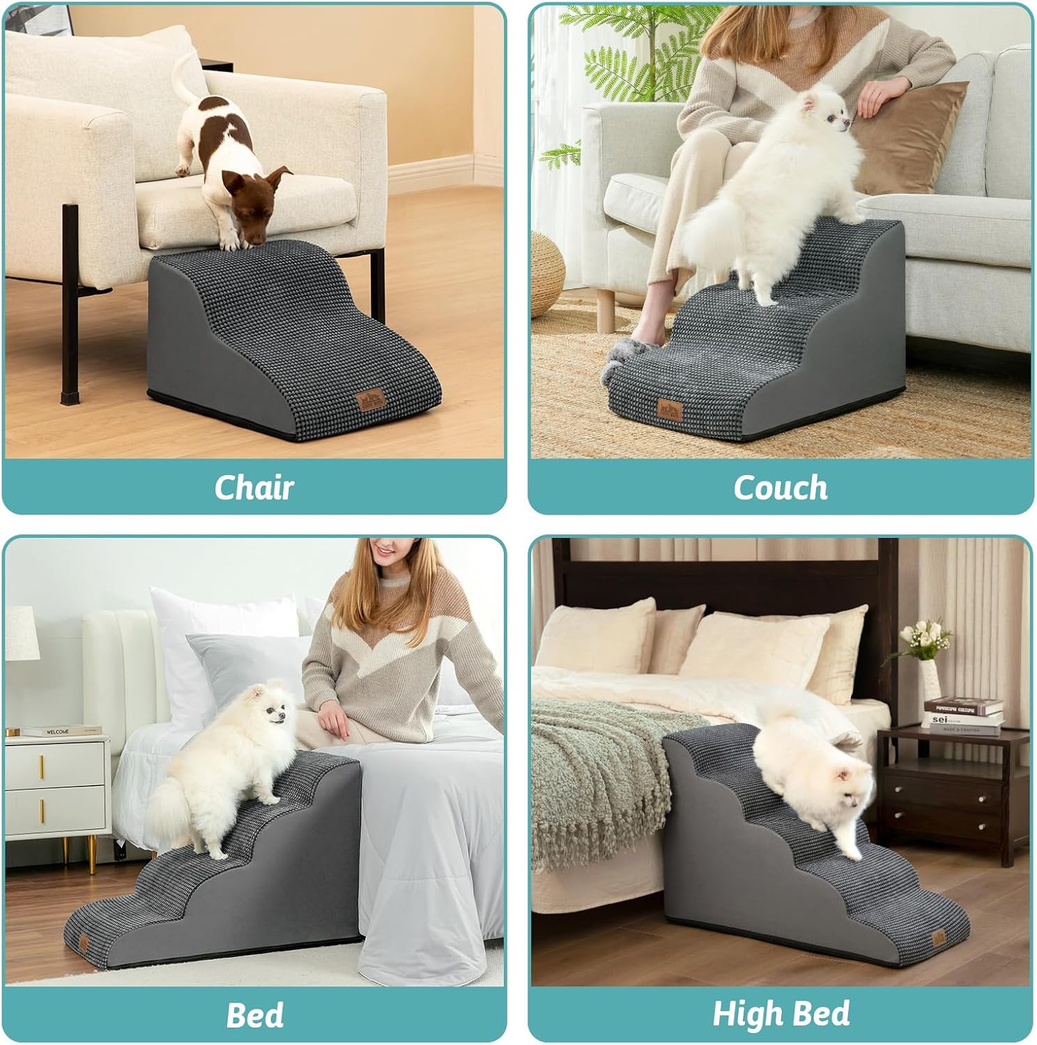 - HIGH DENSITY SPONGE: Foam dog stairs can support up to 80 pounds. Stairs for dogs to get on the bed adopt 30D high-density pure sponge, which provides better support, reducing the pressure on the joints when pets repeatedly jump on high bed, sofa, couch and car. The stairs are covered with high-quality corduroy to provide additional stability