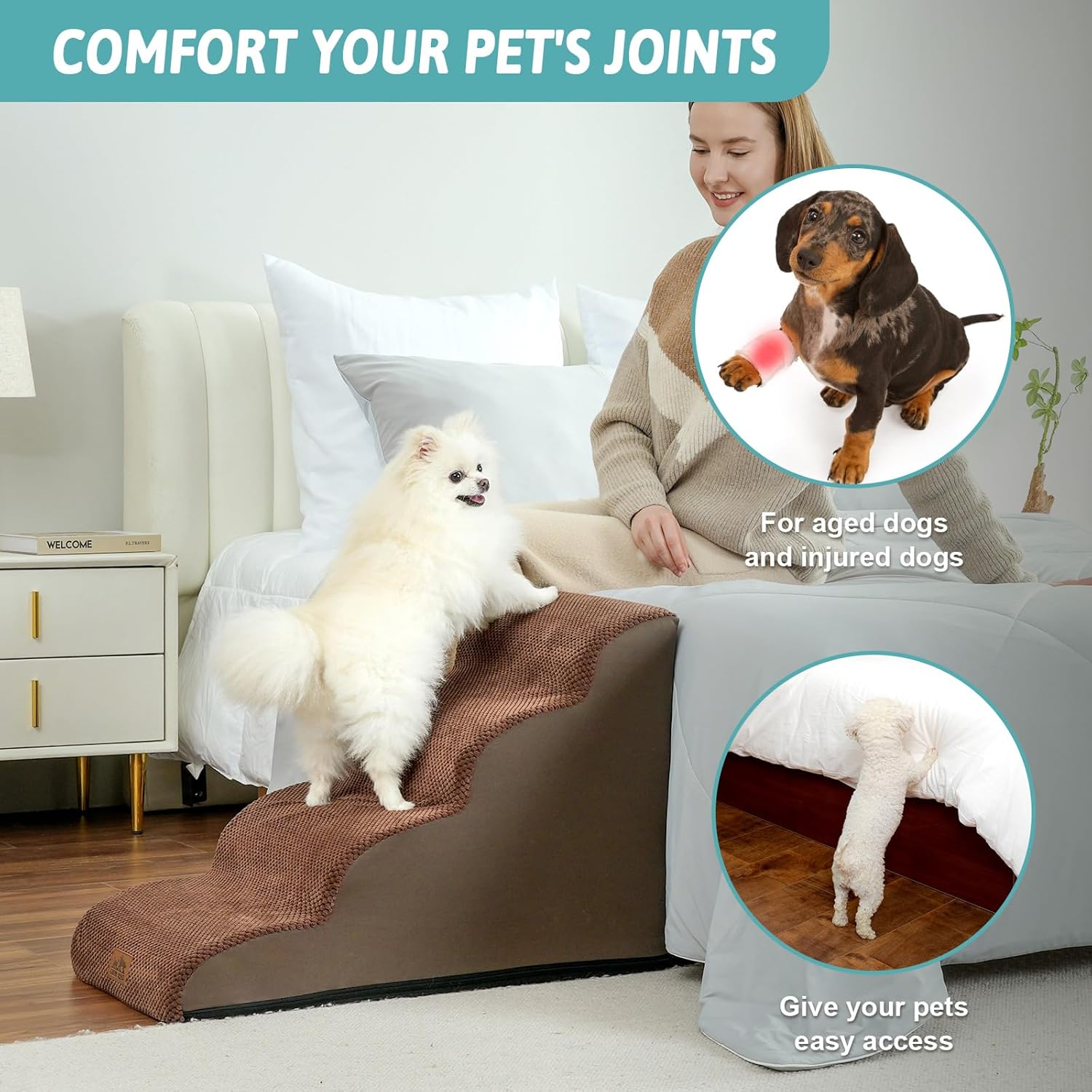 - HIGH DENSITY SPONGE: Foam dog stairs can support up to 80 pounds. Stairs for dogs to get on the bed adopt 30D high-density pure sponge, which provides better support, reducing the pressure on the joints when pets repeatedly jump on high bed, sofa, couch and car. The stairs are covered with high-quality corduroy to provide additional stability