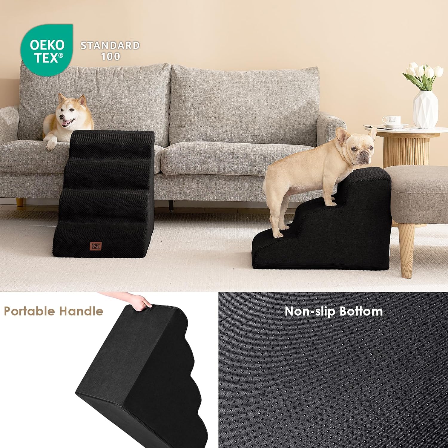 - SPECIFIC AND STEADY DESIGN - 33D density of pure foam make this stair more steady when your pets walk on. The dog bed stairs can provide strong support for pets in the walking process. Low angle slope design can better protect your pet's joints.
