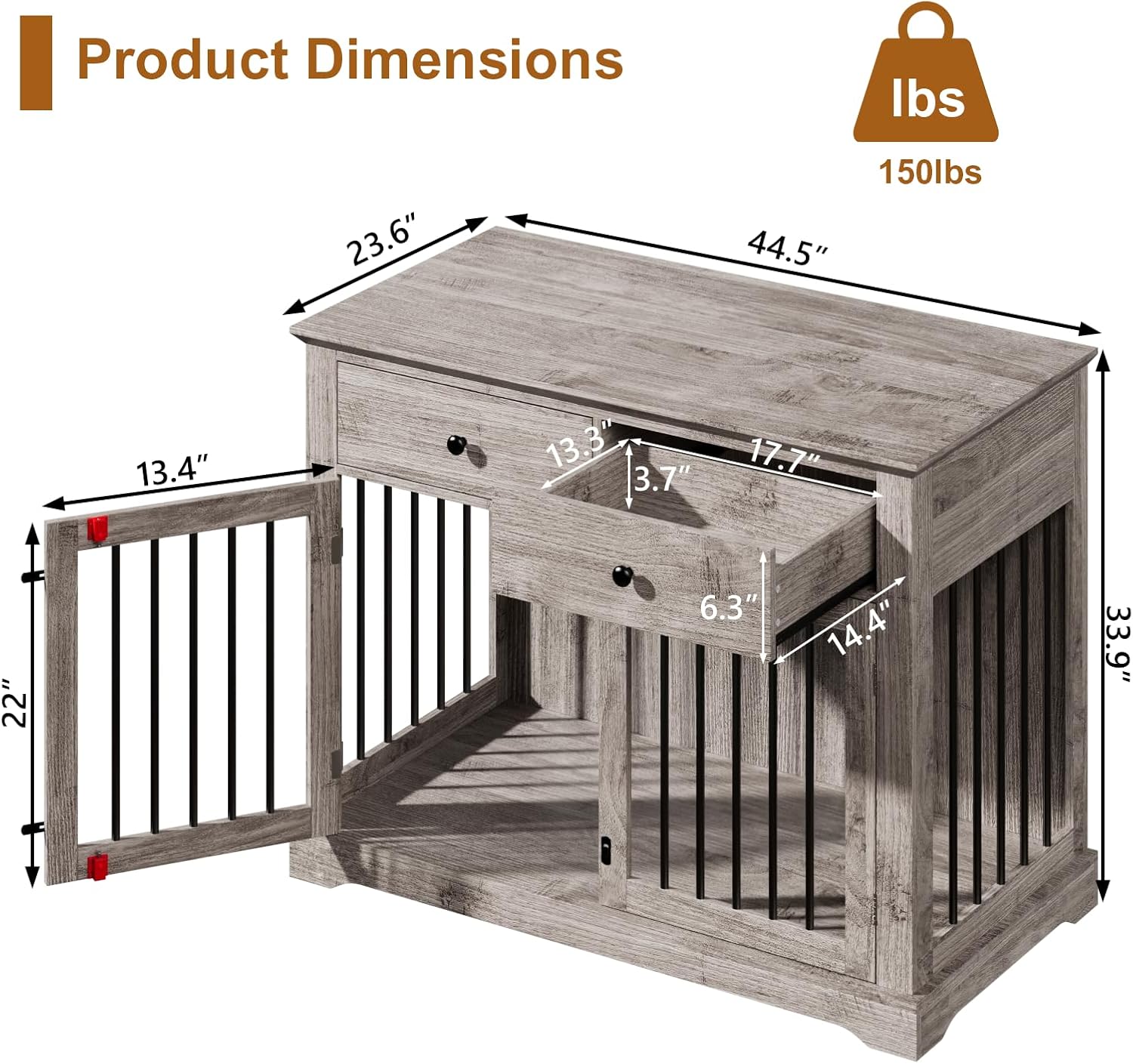 • PUKAMI Dog Crate: Overall Size: 44.5"L x 23.6"W x 34.5"H; Drawers Size: 13.4"L x 18.5"W. This furniture style dog crates can be serves as End Table,Display Stand, etc. Rustic color and appearance complement your home decor