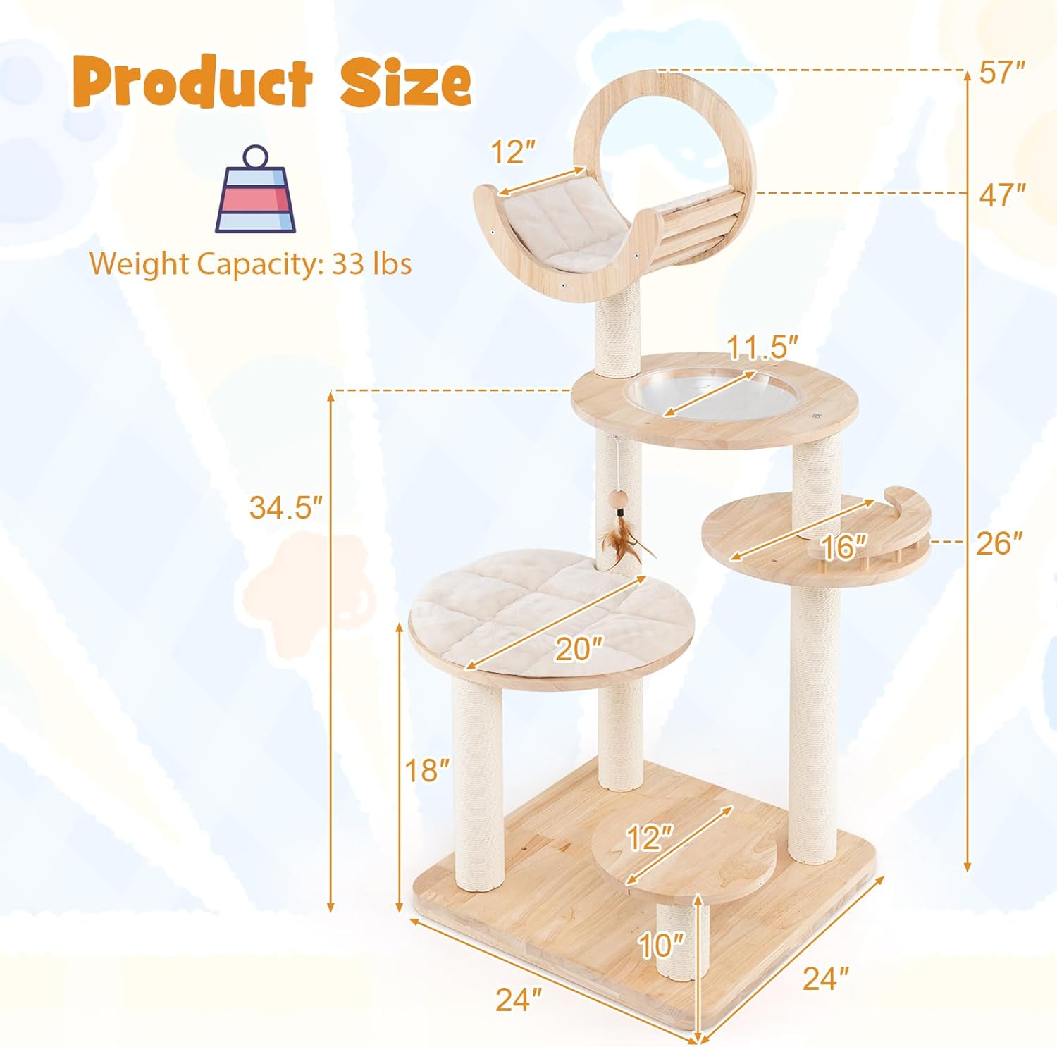 - Durable & Stable Structure: The multi-level cat tree is well balanced with a wide thickened base. And the kitten activity center is crafted with solid rubber wood, which is known for its sturdiness and resistance to cracking, thus ensuring long lifespan.