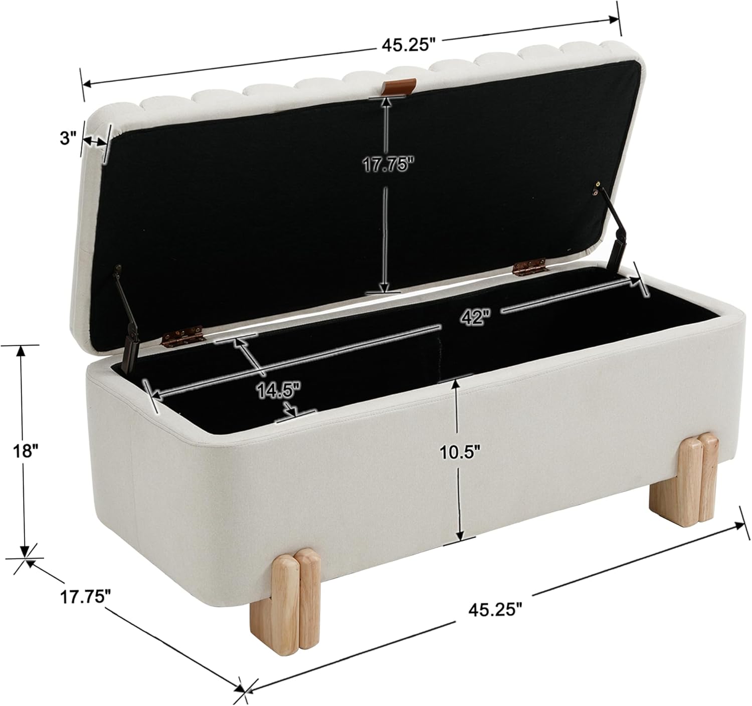 - SIZE DEMENSION AND STORAGE SPACE-Overal size:17.75"D×45.25"W × 18"H; Internal storage space: 14.5"D×42"W × 10.5"H. Not only is it an elegante furniture that can enhance aesthetics, but it is also an large additional storage space. In addition, it slows down the speed of lid closure and increases usage safety, especially when used as a storage stool for children's toys