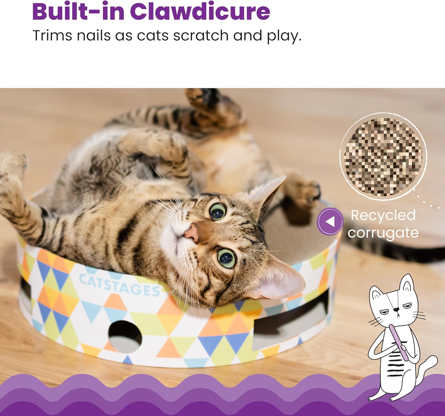 - Corrugate Scratcher for Claw Maintenance: Recycled corrugated cardboard material trims your cat's claws while they play, promoting healthy scratching habits to help protect furniture and keep cats busy