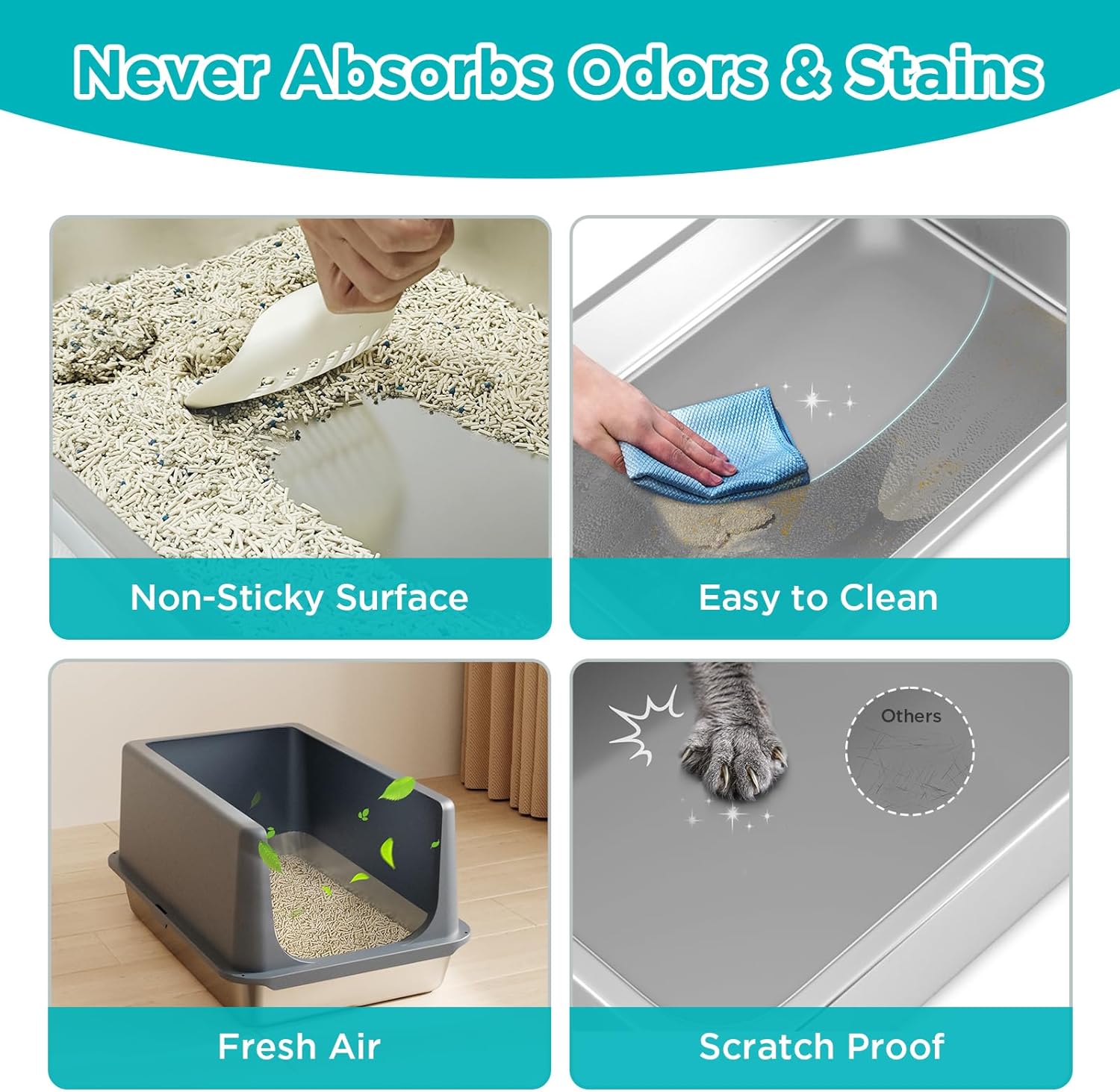 - NON-STICK LITTER BOX STAINLESS STEEL- Easy to wash and clean, no residual odor, rubber anti-slip pads on the bottom of the basin to prevent the big litter box from sliding. Cleaning the high walled enclosed extra large stainless steel litter box with cover for cats is very easy as waste slides off the smooth and nonstick surface effortlessly, leaving no lingering odors behind.