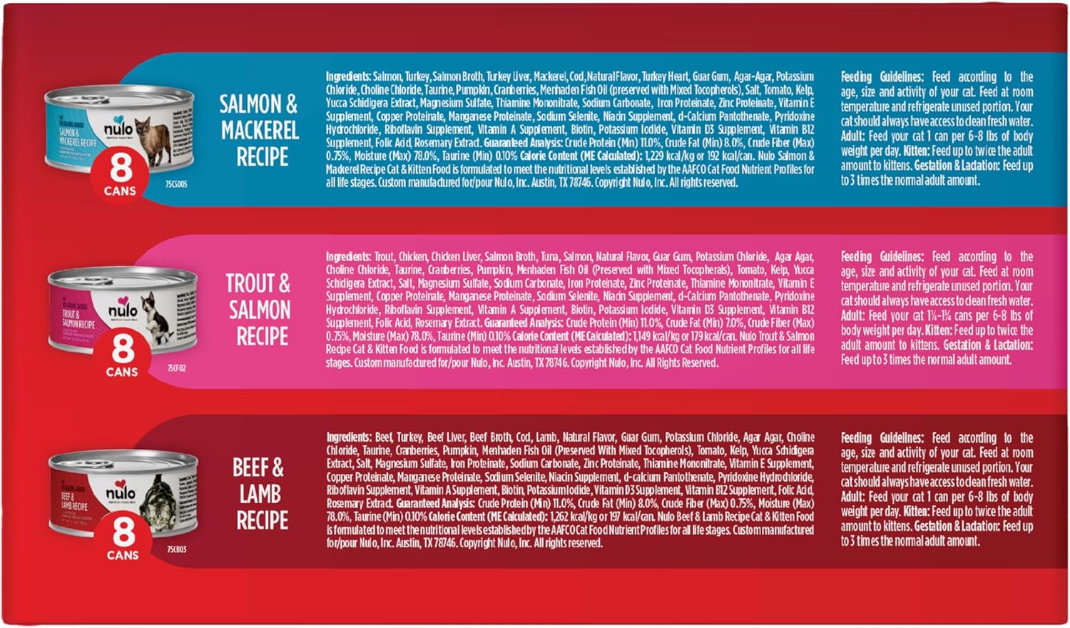 • Nulo Cat GF Salmon Trout Beef Variety Pack - 5.5 oz. - 3 Flavors - Salmon & Mackerel, Trout & Salmon, and Beef & Lamb (24 Cans Total)