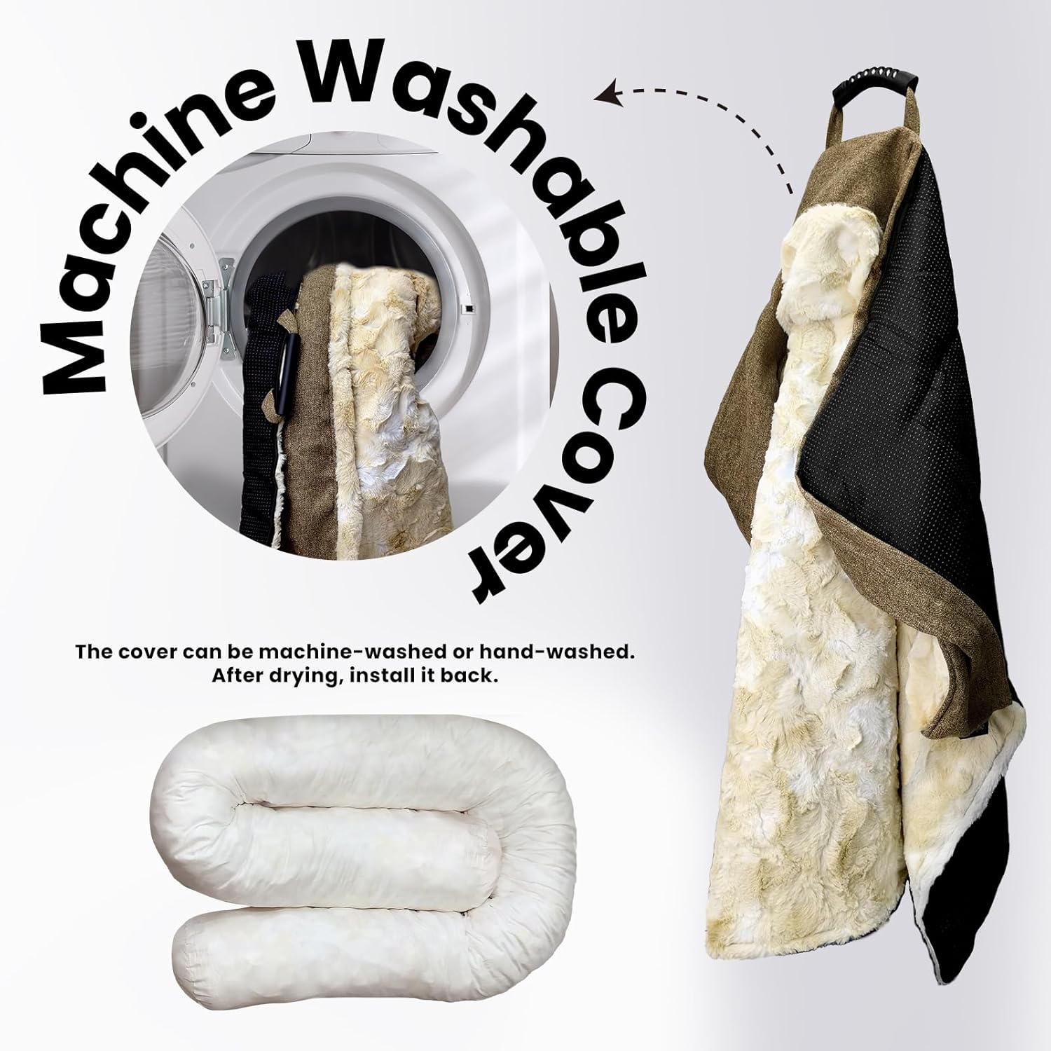 • 𝑷𝒐𝒓𝒕𝒂𝒃𝒍𝒆 𝒂𝒏𝒅 π‘΄π’‚π’„π’‰π’Šπ’π’† 𝑾𝒂𝒔𝒉𝒂𝒃𝒍𝒆: Designed for both comfort and convenience, the dog mat is perfect for pets on the go. With a built-in handle, it’s easy to carry. whether camping, traveling, or protecting car seats. When it’s time to clean, simply remove the cover and toss it in the wash. Keeping your pet’s bed fresh and ready for the next adventure has never been easier.