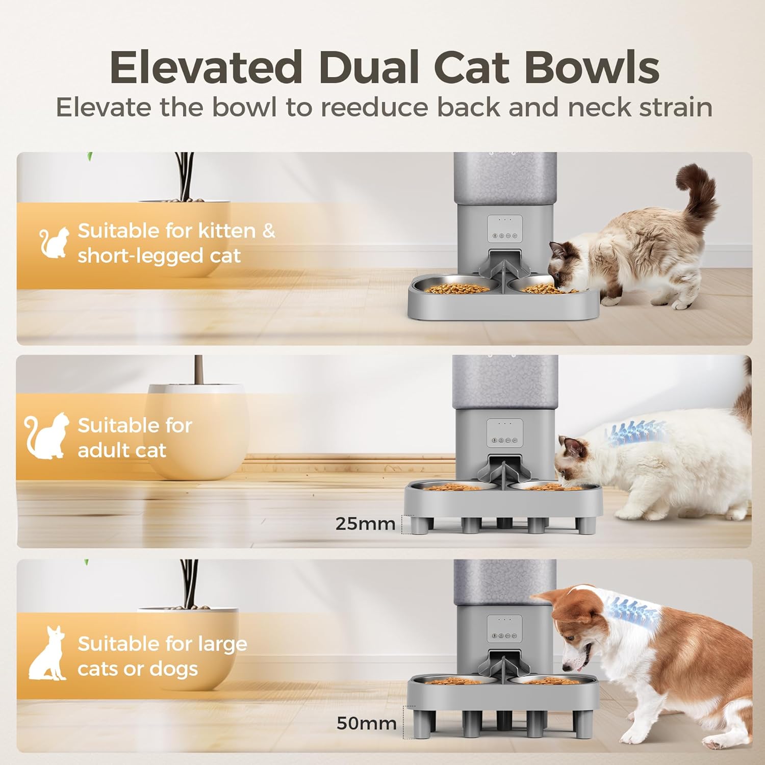 - Elevated Foot Feeder: This cat food dispenser comes with three different sizes of pillars and non-slip foot pads. The 6°tilted and elevated food bowl reduces the strain on pets' bones during feeding, catering to pets of varying heights as they grow. It's suitable for various breeds of cats and dogs